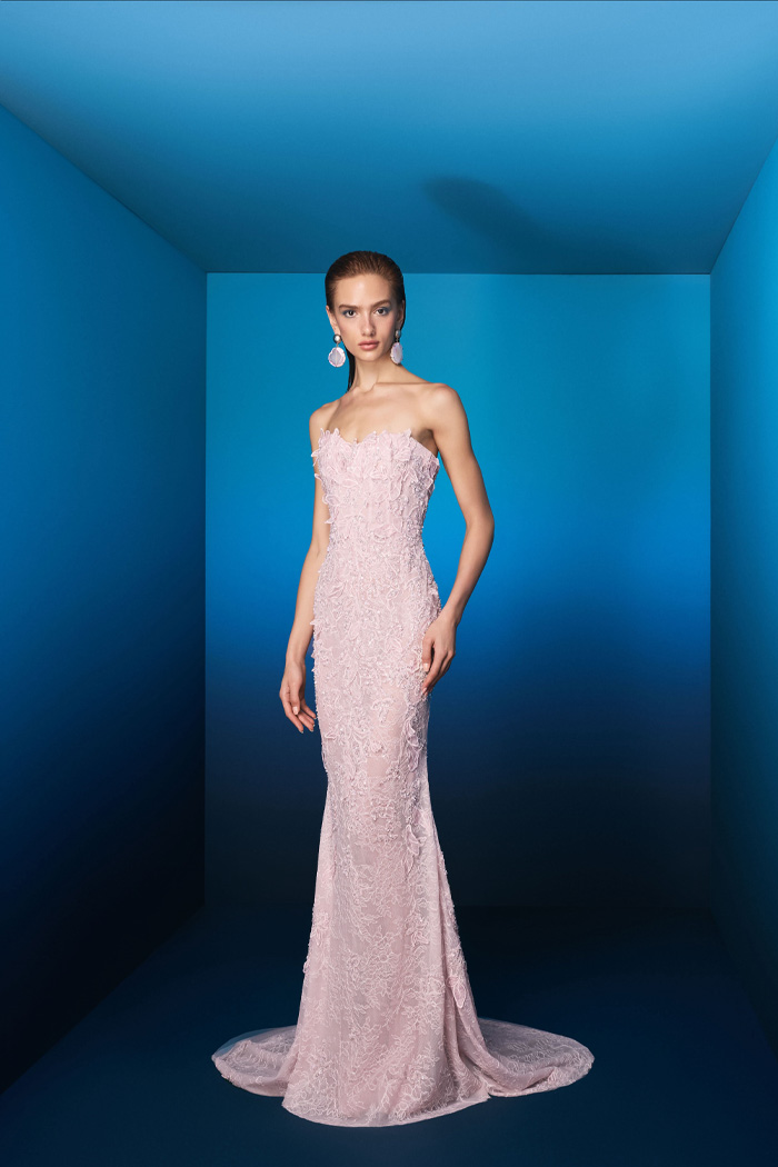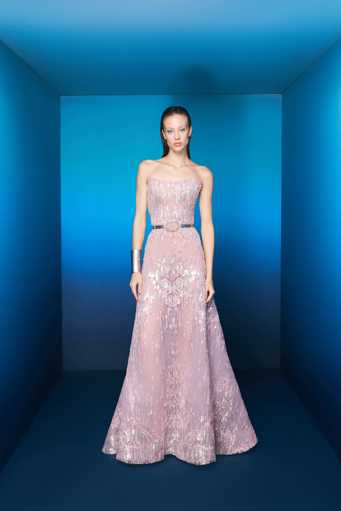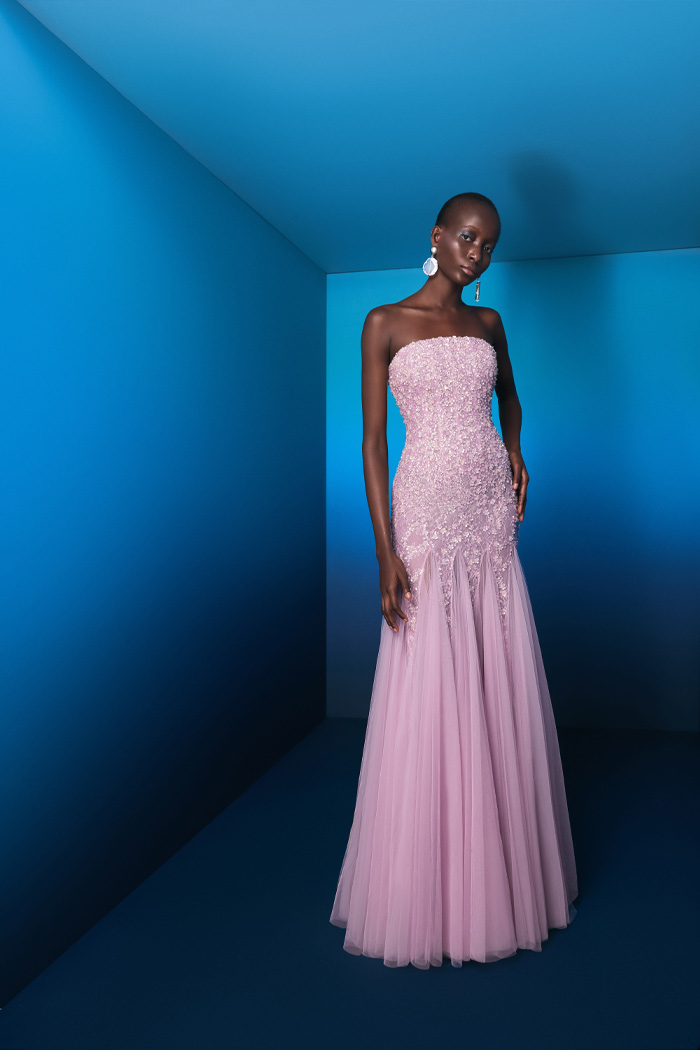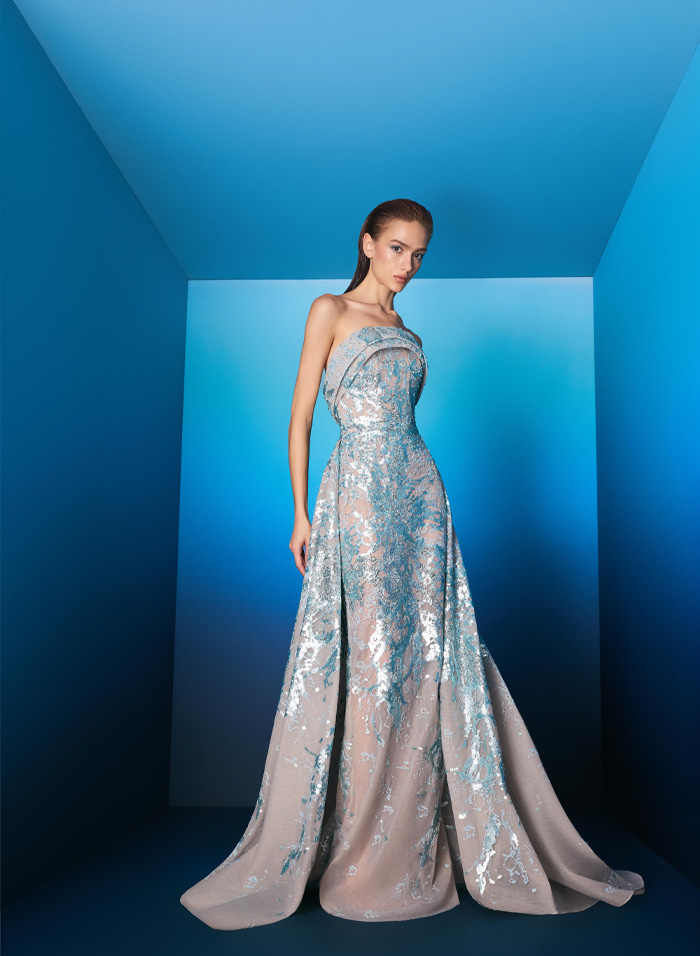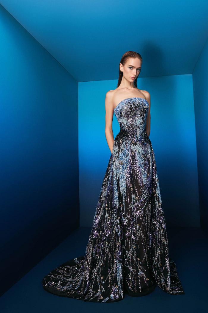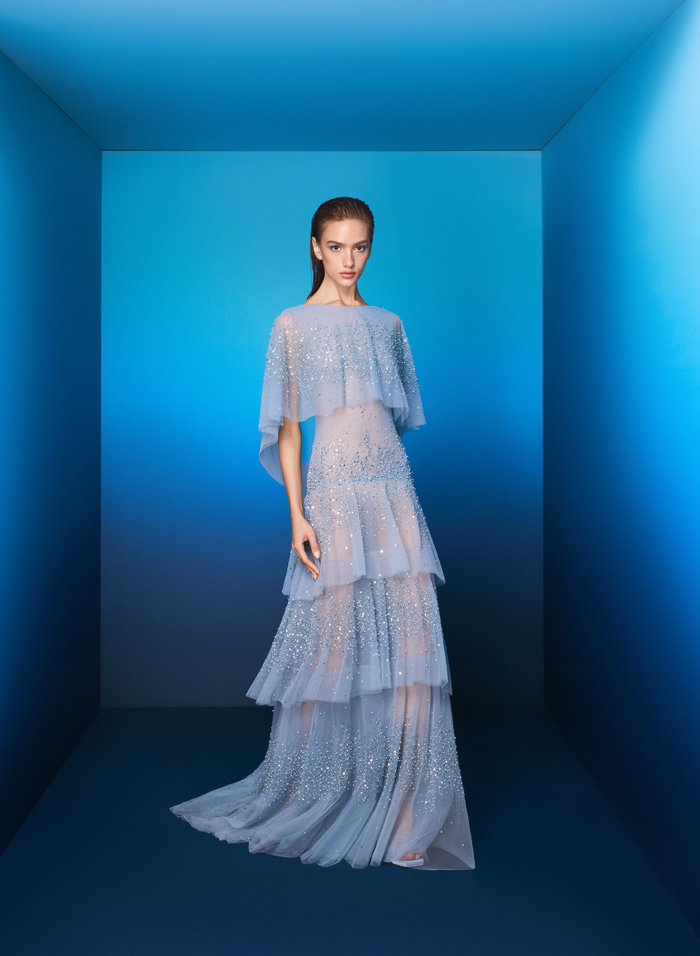 تطاريز متلألئة، دانتيل رقيق وتافتا متأرجحة بين الازرق الداكن والاخضر المائي والللافندر، مع سحر الوردي الكوارتز والباستيل السماوي، فضلا عن الاسود الأنيق والخيوط المطرزة مع الخرز والمتلألئة كالمرجان.