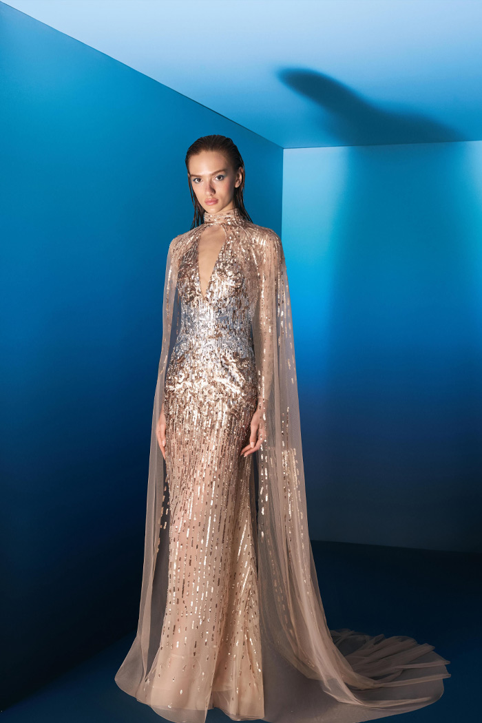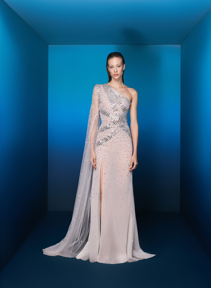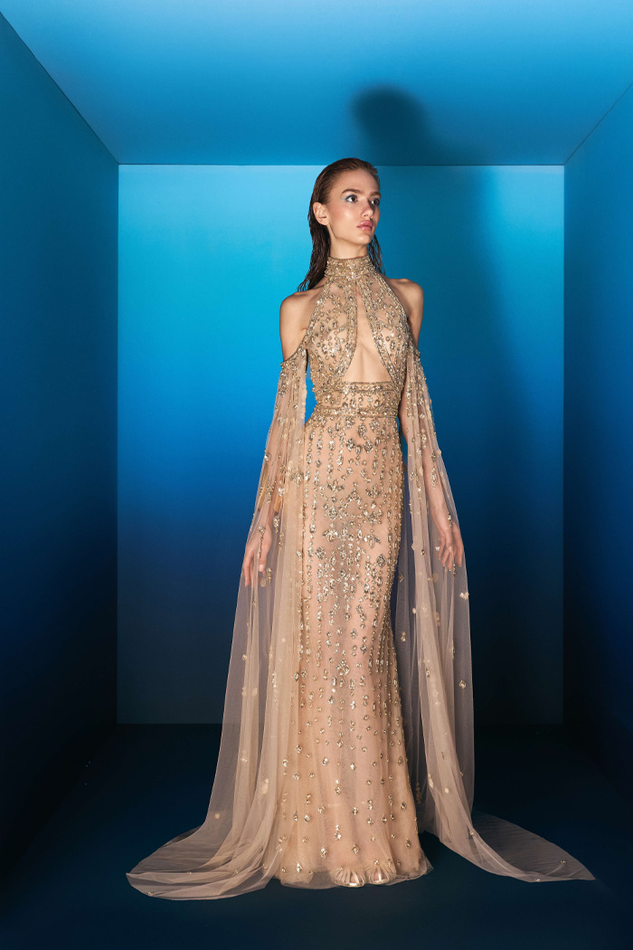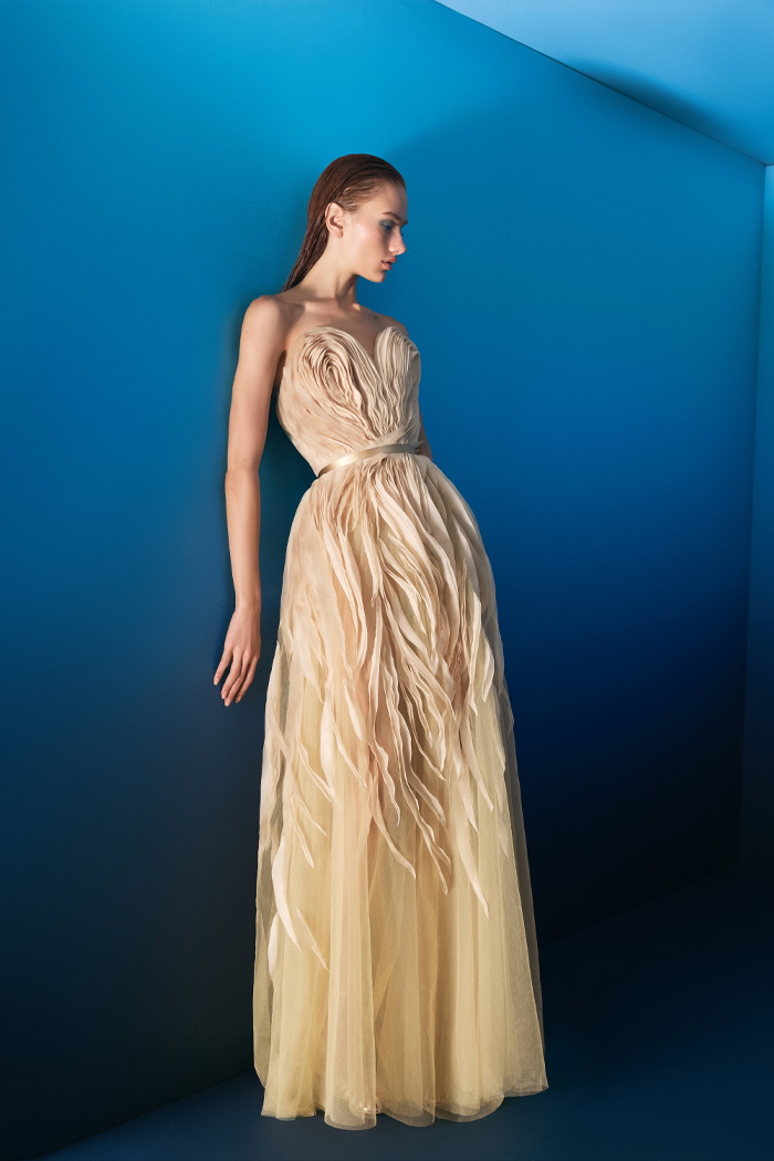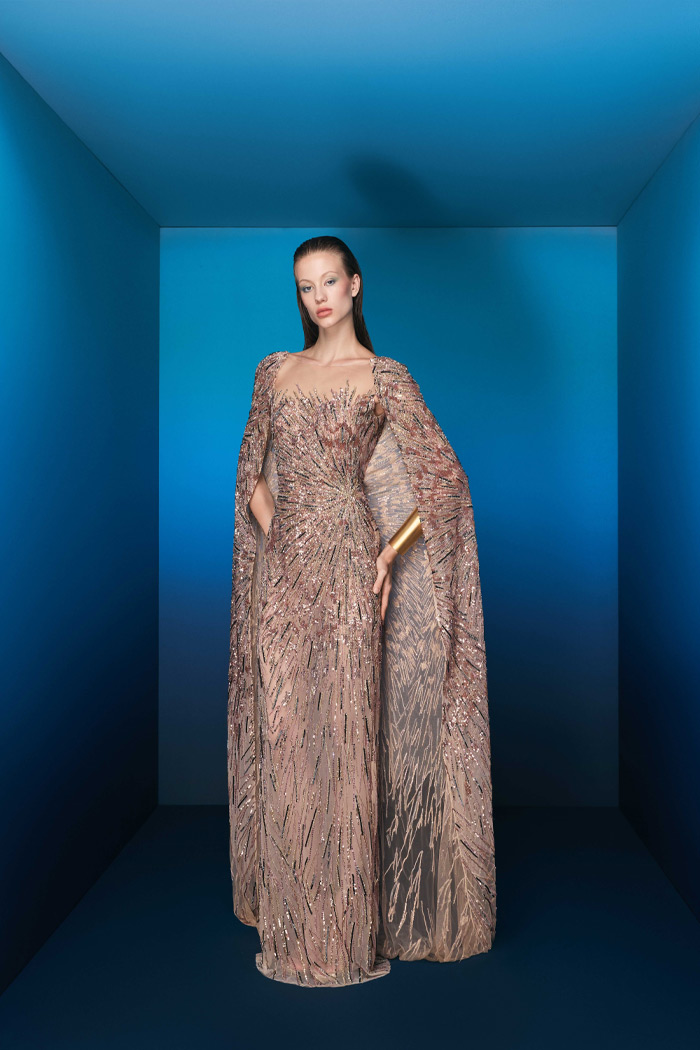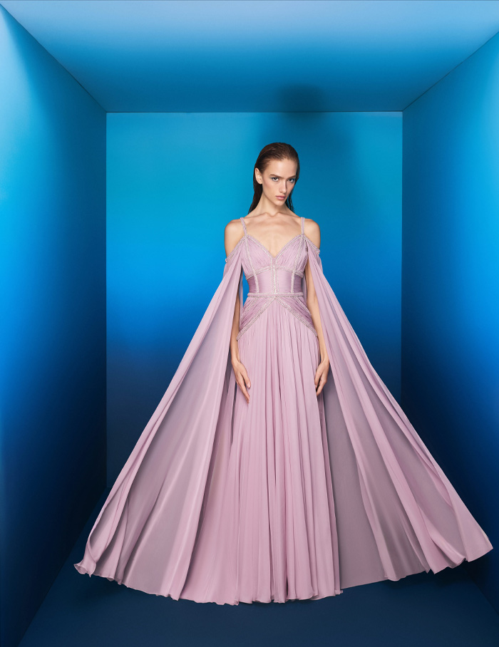 تطاريز متلألئة، دانتيل رقيق وتافتا متأرجحة بين الازرق الداكن والاخضر المائي والللافندر، مع سحر الوردي الكوارتز والباستيل السماوي، فضلا عن الاسود الأنيق والخيوط المطرزة مع الخرز والمتلألئة كالمرجان.