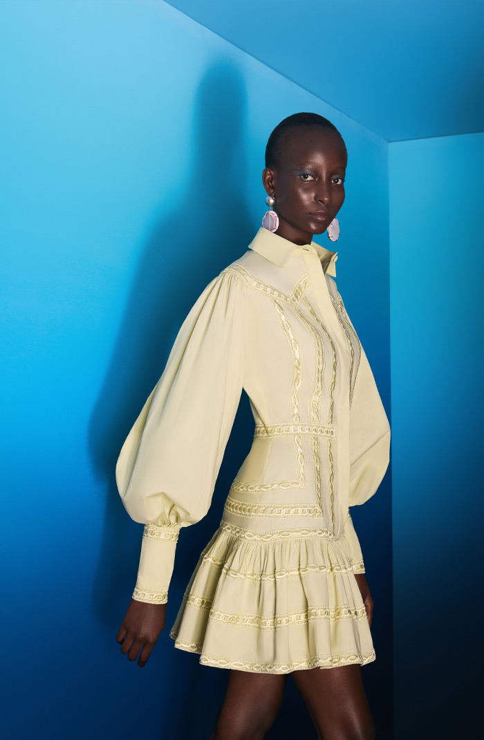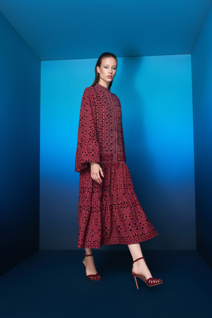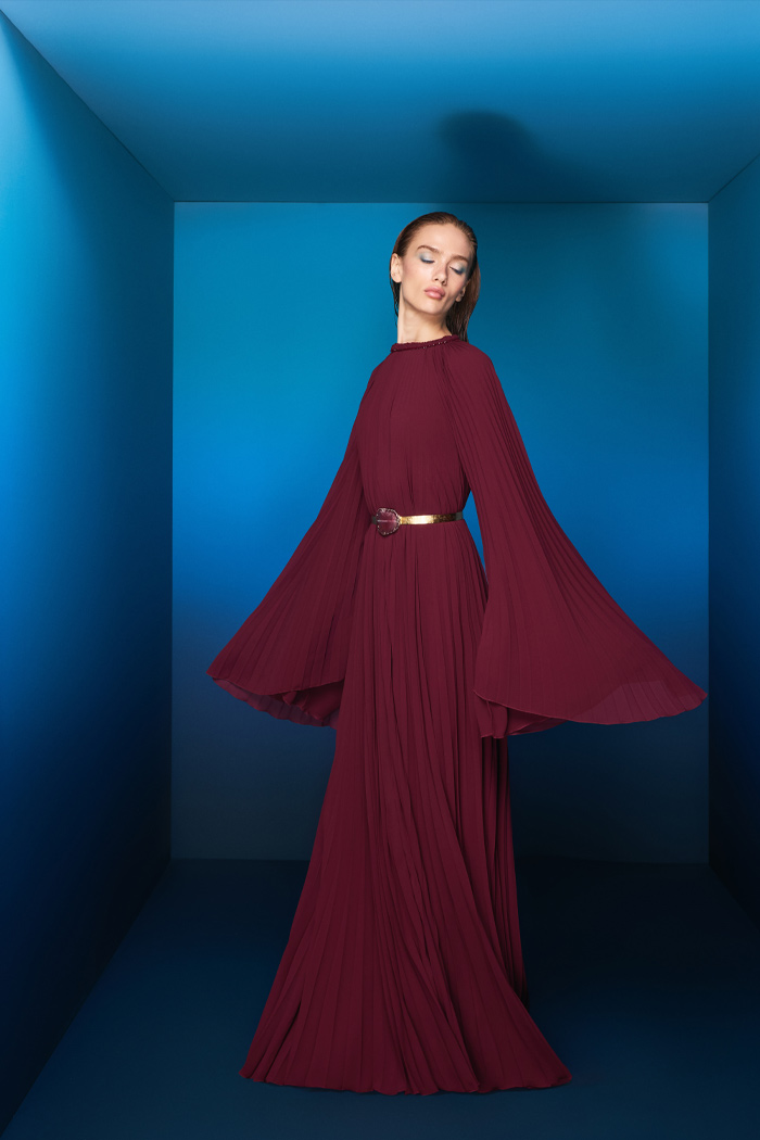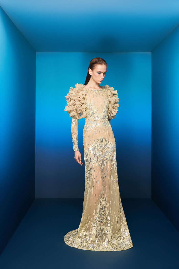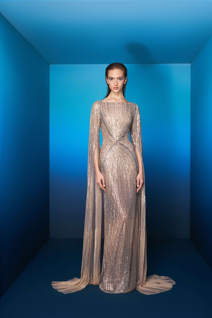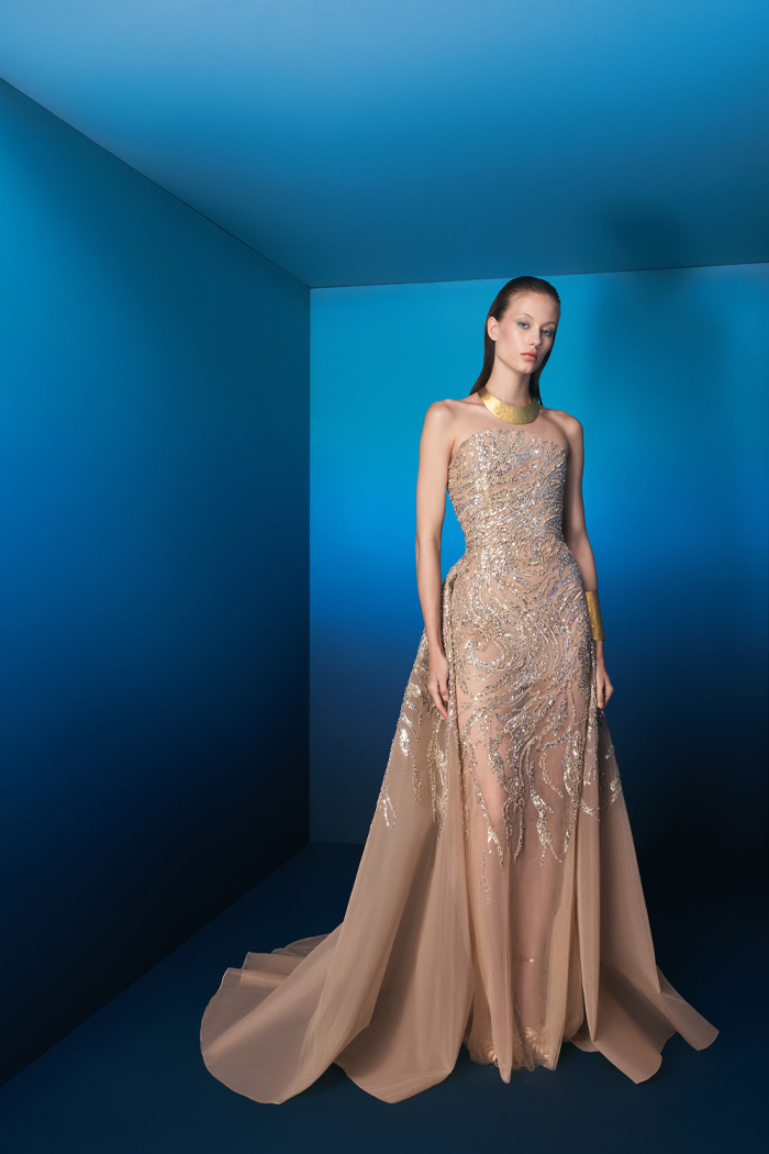 تطاريز متلألئة، دانتيل رقيق وتافتا متأرجحة بين الازرق الداكن والاخضر المائي والللافندر، مع سحر الوردي الكوارتز والباستيل السماوي، فضلا عن الاسود الأنيق والخيوط المطرزة مع الخرز والمتلألئة كالمرجان.