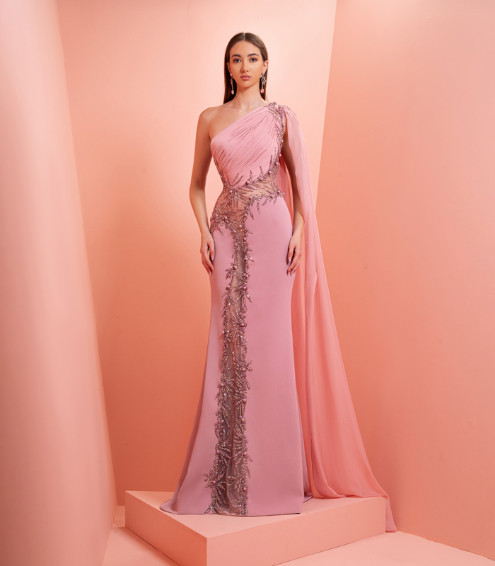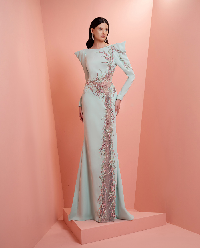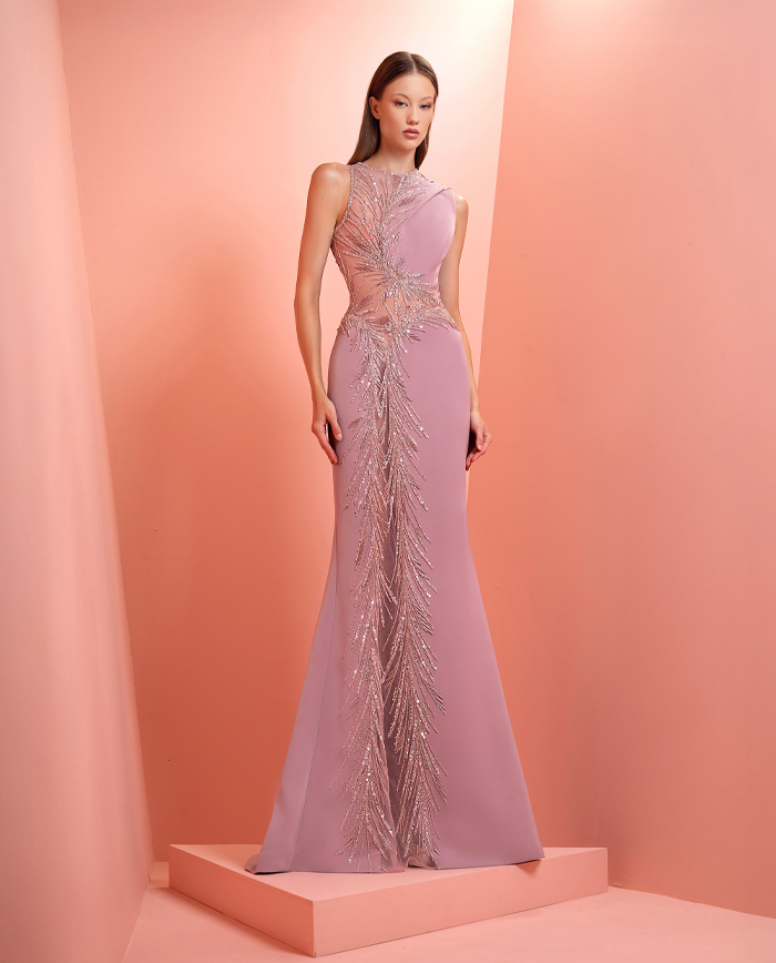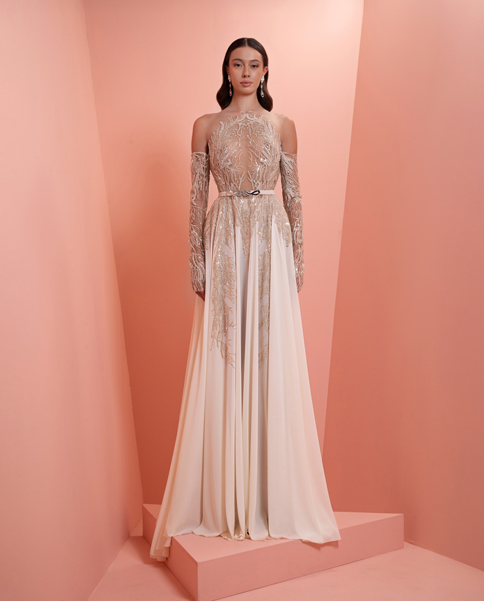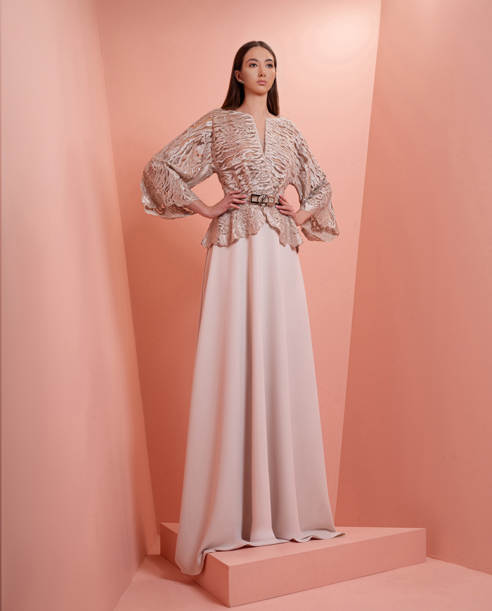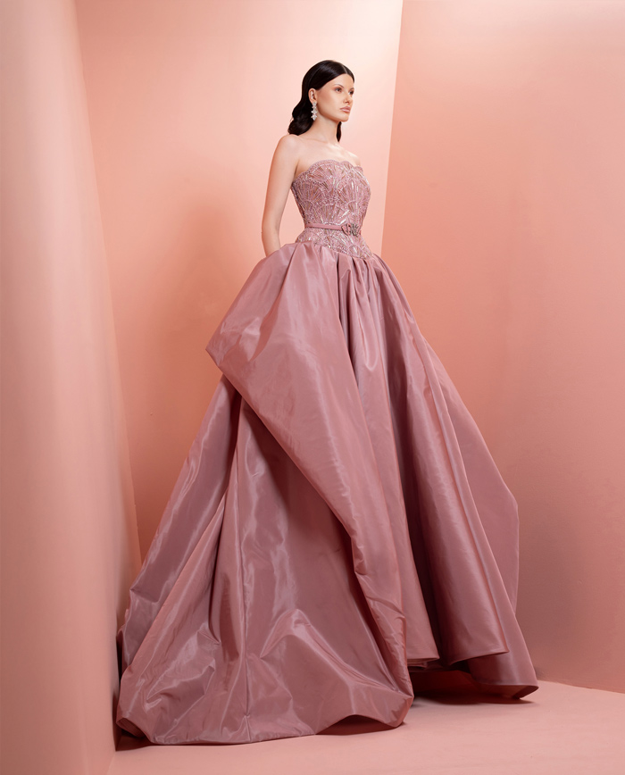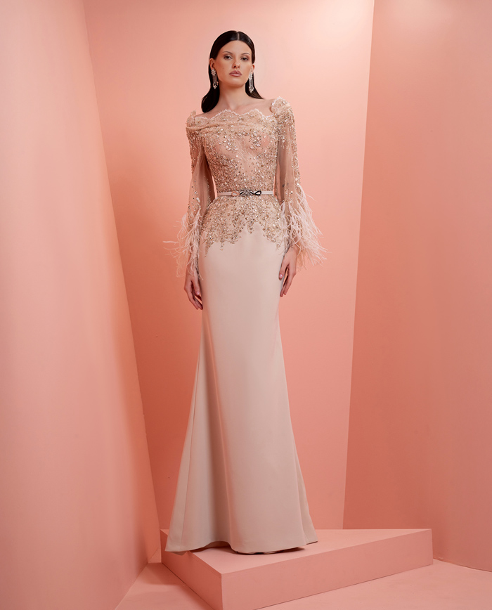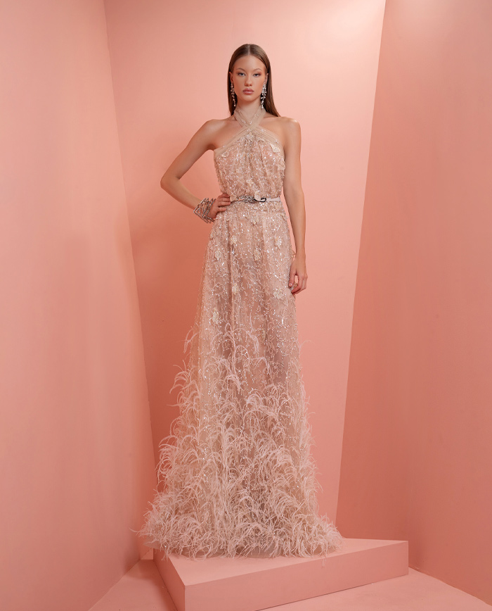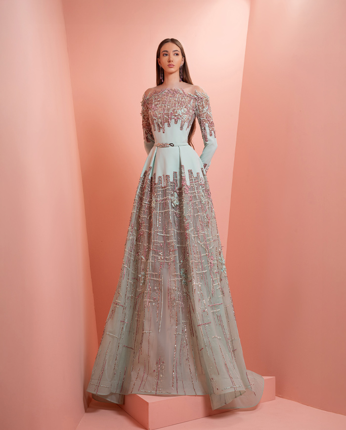 ويعكس التدرج الثاني في تفاصيل الأقمشة المعتمدة والتصاميم إذ تتأرجح التصاميم بين نعومة الكريب والشيفون والتول والدانتيل، إضافة إلى الريش الذي يمنح بعض الإطلالات لمسة درامية حالمة والهادئة من جهة، الى قطع تزدان بالشك والتلألؤ من جهة أخرى، مما يمنح المرأة خيارات متعددة تناسب لحظات مختلفة.