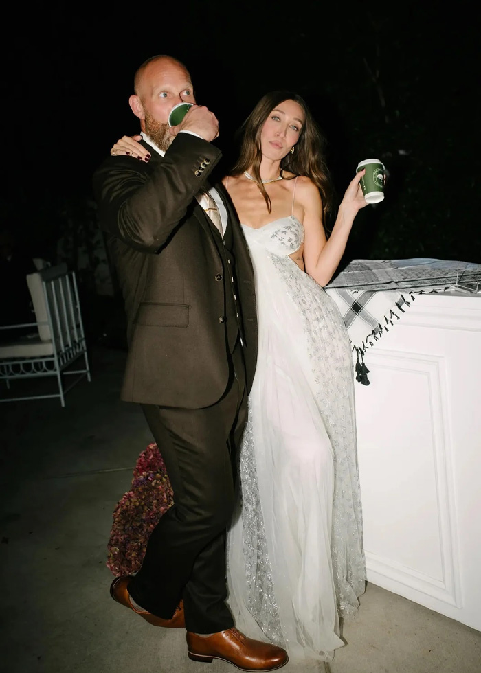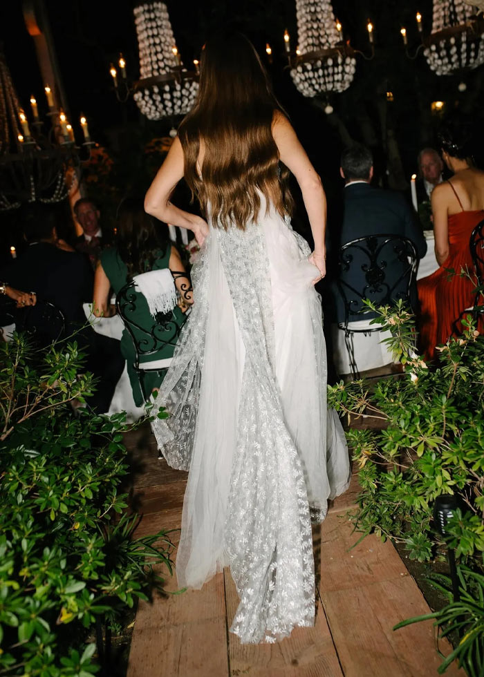 وبعد أن تألقت خلال المراسم بفستان فينتاج Vivienne Westwoodمع طرحة طويلة مطرّزة ، أطلّت العروس في سهرة الاحتفال بفستان ساحر من توقيع المصممة اللبنانية ساندرا منصور. حمل بصمتها الأنثوية الحالمة التي تجمع بين الرومانسية والأناقة البوهو الراقية.
