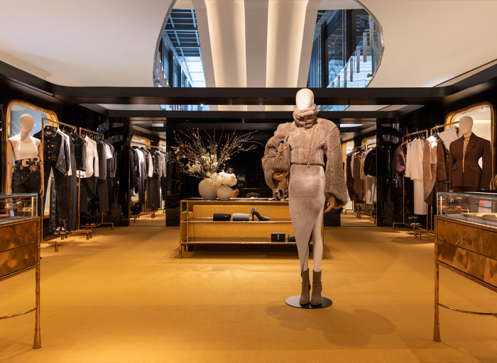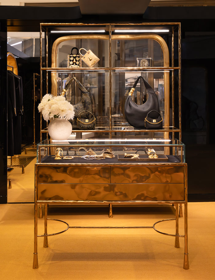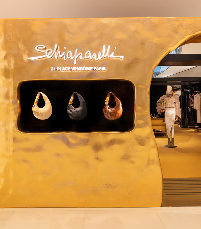 يأخذ هذا البوب-أب مكانه كتألق تحفة هندسية رائعة في "فاشن أڤنيو" داخل دبي مول: صندوق نحتي مُغطّىّ بالذهب يعكس رموز الدار الشهيرة. جدرانه، المستوحاة من ملمس النحاس المدقوق، تتألق تحت الأضواءً، مزينة بنقوش ناعمة لرموز سكياباريلي — معاد تفسيرها كتجليات معاصرة للفخامة السريالية. الداخل يستحضر أجواءً 21 Vendôme Place ، المنزل الباريسي التاريخي لسكياباريلي. فالتباينات الشاعرية بين الذهب واللكر الأسود تعيد إحياءً روح صالونات الدار التي صمّمها جان ميشيل فرانك Franck) (Jean-Michel خصيصاً لإلسا سكياباريلي Schiaparelli).