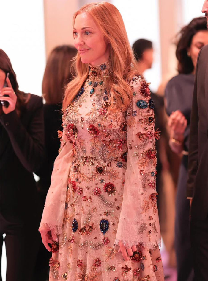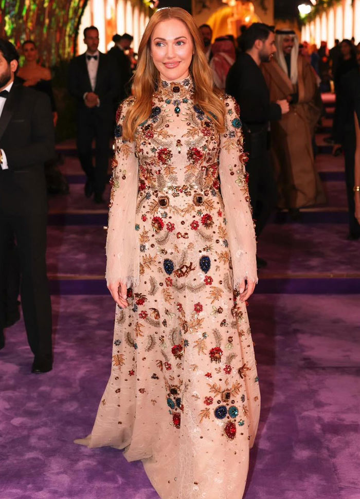 وقد تميّز الفستان بلونه الآسر وتفاصيله الراقية المرصّعة بالأحجار الكريمة، بحيث انعكست الحرفية العالية والدقّة المتناهية في التنفيذ في كل تفصيل. تصميم يحمل بصمة فنية متفرّدة وقصّة مدروسة، عكست توازنًا متناغمًا بين الفخامة والرقي.