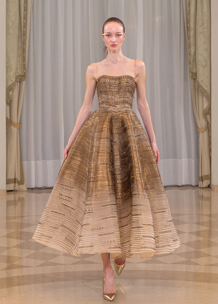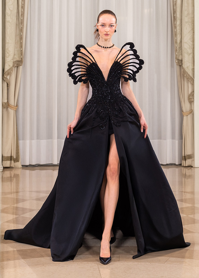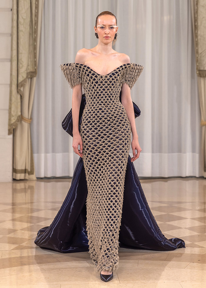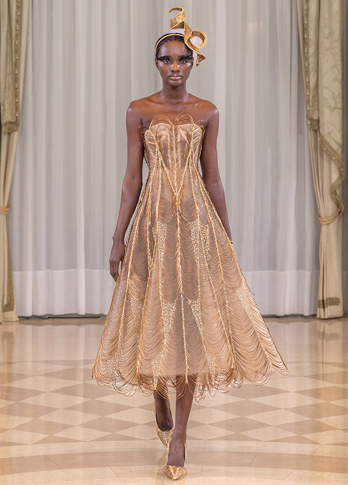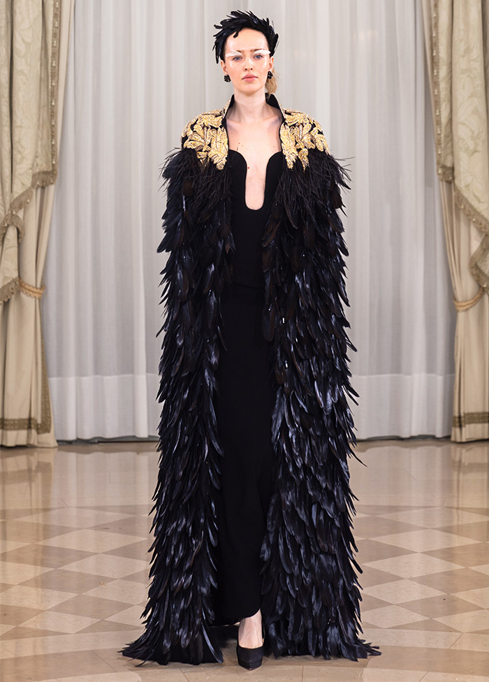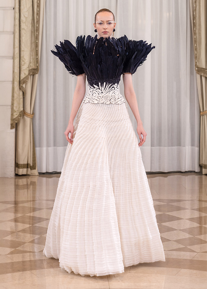 و يبرز الفستان الأيقوني المصنوع من جلد الشامواه، والذي قُطّع بأشعة الليزر إلى آلاف القطع الفريدة، ثم جمعت بعنايةٍيدوية فائقة وزينت بطبقات غير منتظمة من الترصيعات لتشكلّ سطحاً متغيراً ينبض بالإشعاع. كما، يتشابك الريش ضمن إطلالةٍ أخرى، وكأنه ينمو بشكلٍ عضوي من خطوط التصميم، مكسو بطبقة من التول الحريري لصياغة بنية ناعمة غنية بالحجم والحركة، مع ترك الحواف الخام مكشوفة عن عمدٍ لتعزيز الطابع الطبيعي والفنّي.