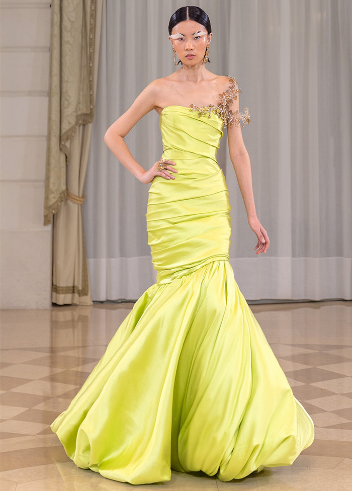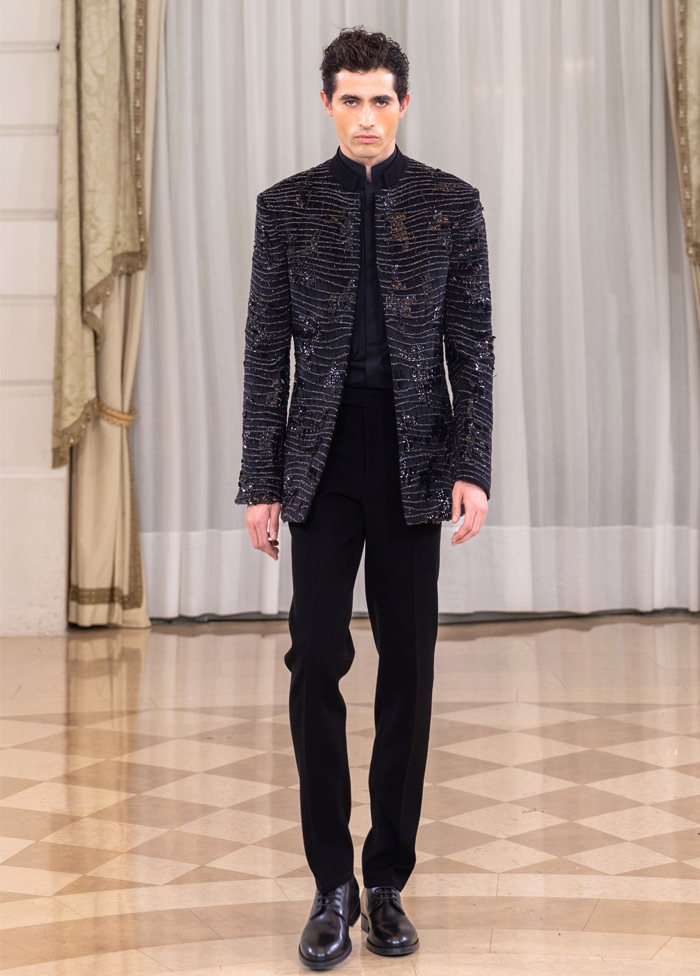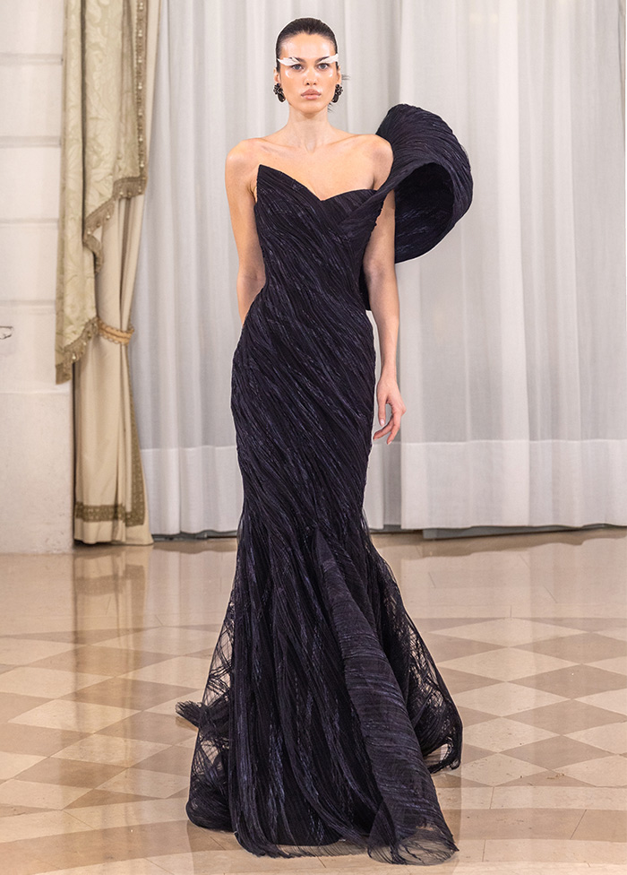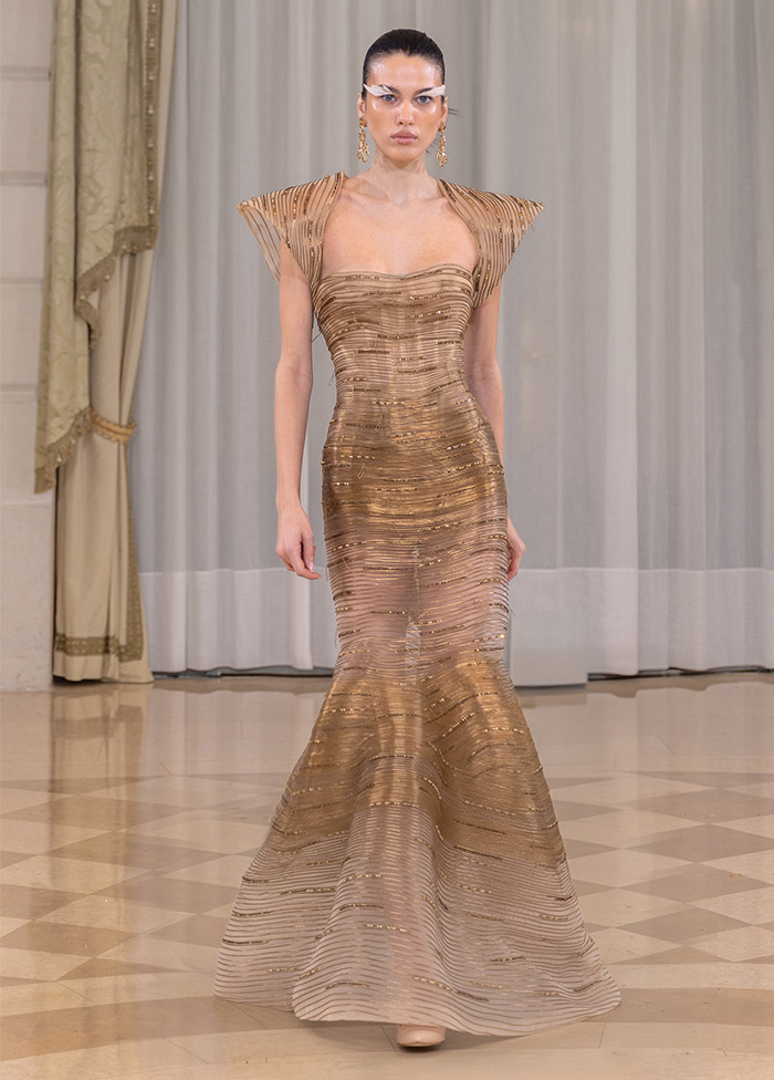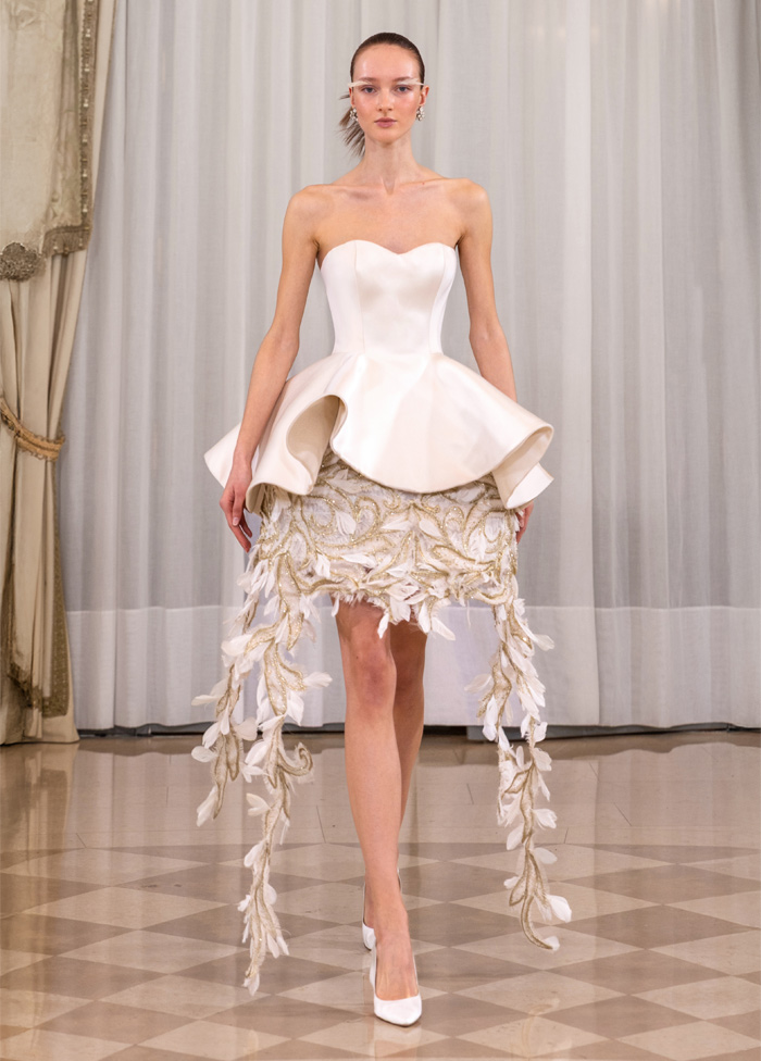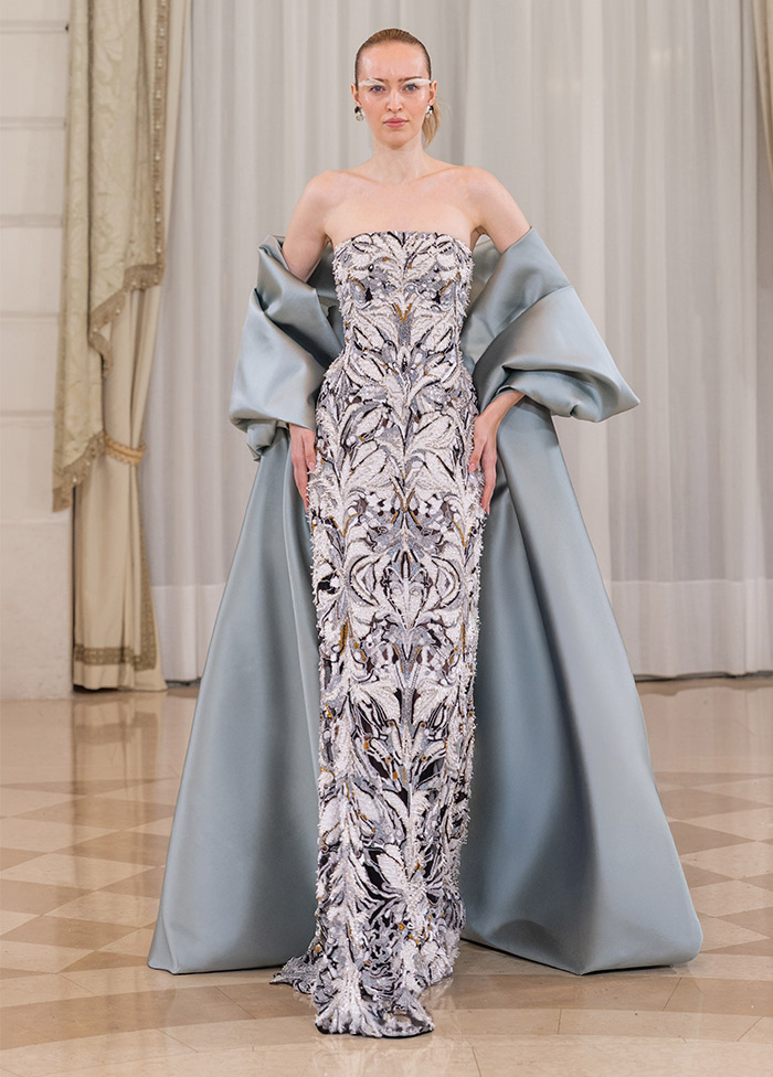 و يبرز الفستان الأيقوني المصنوع من جلد الشامواه، والذي قُطّع بأشعة الليزر إلى آلاف القطع الفريدة، ثم جمعت بعنايةٍيدوية فائقة وزينت بطبقات غير منتظمة من الترصيعات لتشكلّ سطحاً متغيراً ينبض بالإشعاع. كما، يتشابك الريش ضمن إطلالةٍ أخرى، وكأنه ينمو بشكلٍ عضوي من خطوط التصميم، مكسو بطبقة من التول الحريري لصياغة بنية ناعمة غنية بالحجم والحركة، مع ترك الحواف الخام مكشوفة عن عمدٍ لتعزيز الطابع الطبيعي والفنّي.