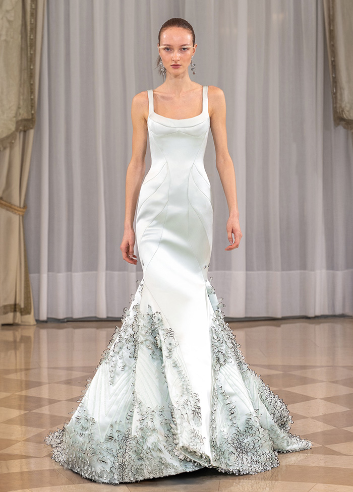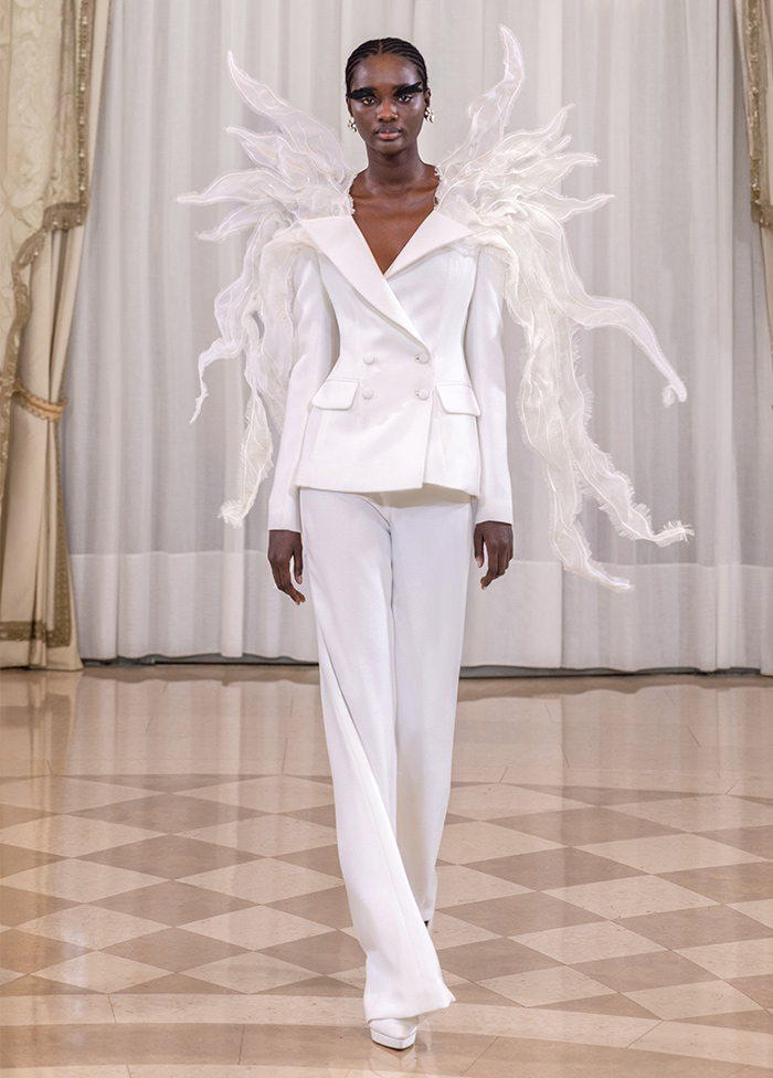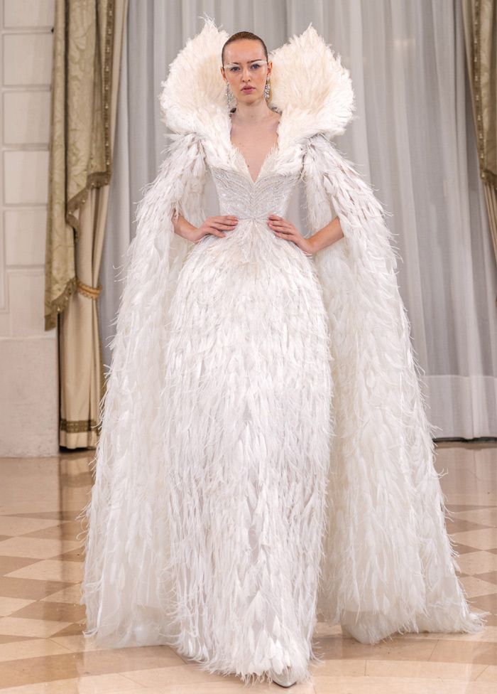 كما ويشكلّ فستان الزفاف جوهر وروح المجموعة، بحيث يكسى بالكامل بريش مثبّت بعنايةٍ يدوية فائقة، مانحاً إياه هالةً من الخفّة والشفافية. يتميز الفستان بقصّة A النحتية، أكمام طويلة مزخرفة، وأجنحة ريشية درامية.