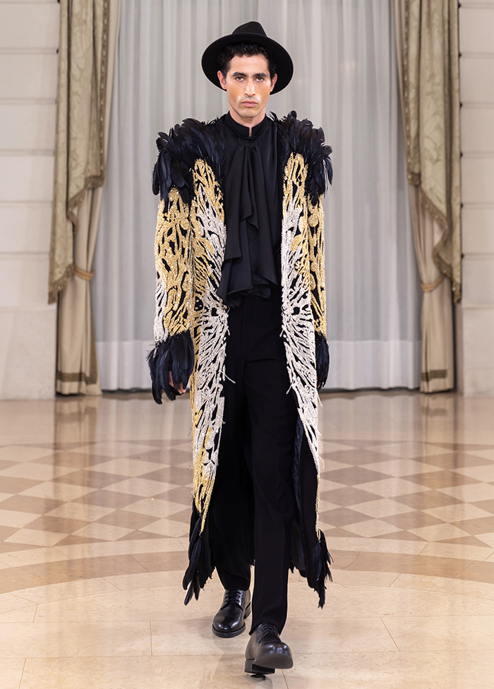 في صميم REBIRTH، تتجلّى حِرفَية الكوتور في أبهى صورها. فكل قطعة منجزة يدوياً بالكامل، وتتطلبّ ما بين 600وأكثر من ألف ساعة من العمل الحِرفَي بالغ الدقّة. عشرات الآلاف من الخرز، الكريستالات، الخيوط والريش، جميعها تثبت يدوياً، اعتمادًا على تقنيات متوارثة عبر الأجيال، تجسّد ذاكرة الحرفة واستمراريتها. كما أعيدت مقاربةالريش المختار بعناية، منه ريش طائر ليدي أمهيرست القادم من شمال ميانمار وريش التَم الأخرس من الدنمارك، في سياق عملية الكوتور، بوصفه رمزًا للهجرة، الاستمرارية والتحوّل المستمر.