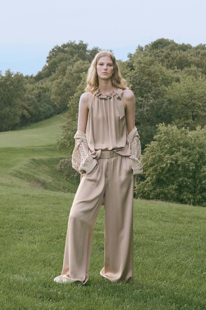 ويُعزّز حيوية الجسد المتحرّك مزيجٌ من خيوط الألباكا المصقولة والقطن، وخيوط الشرائط المعالَجة بالمرسرة، إضافة إلى أنسجة الشبكة المربّعة والتريكو المضفّر ذي التمويهات المعدنية الهادئة.