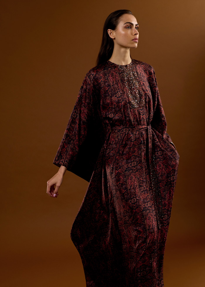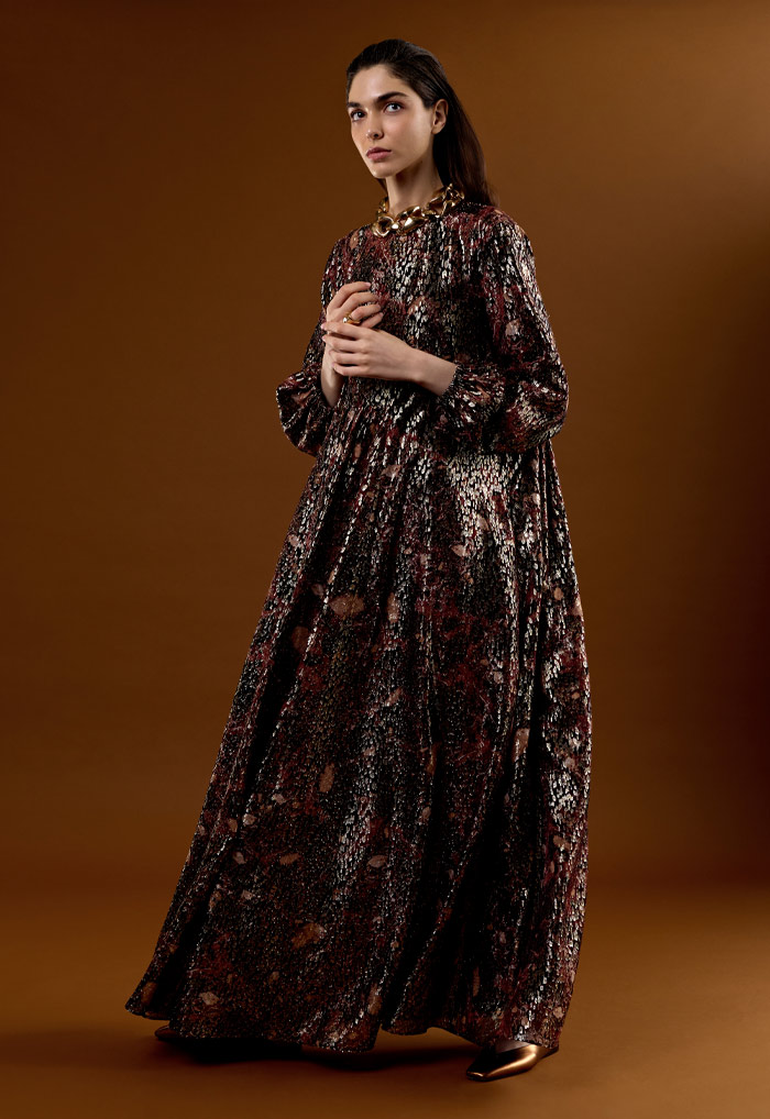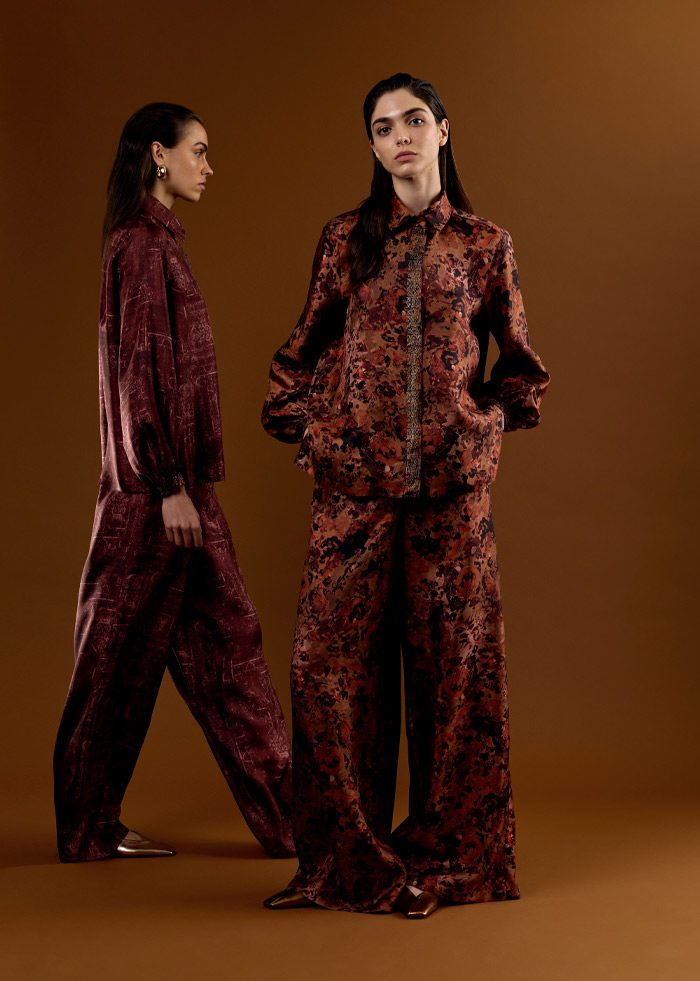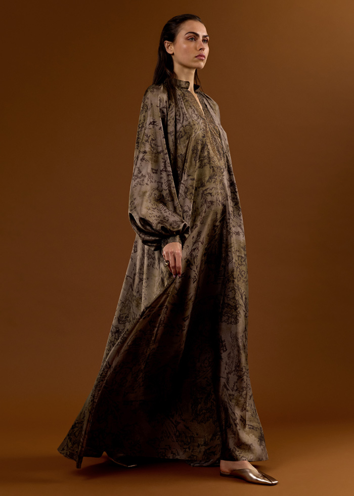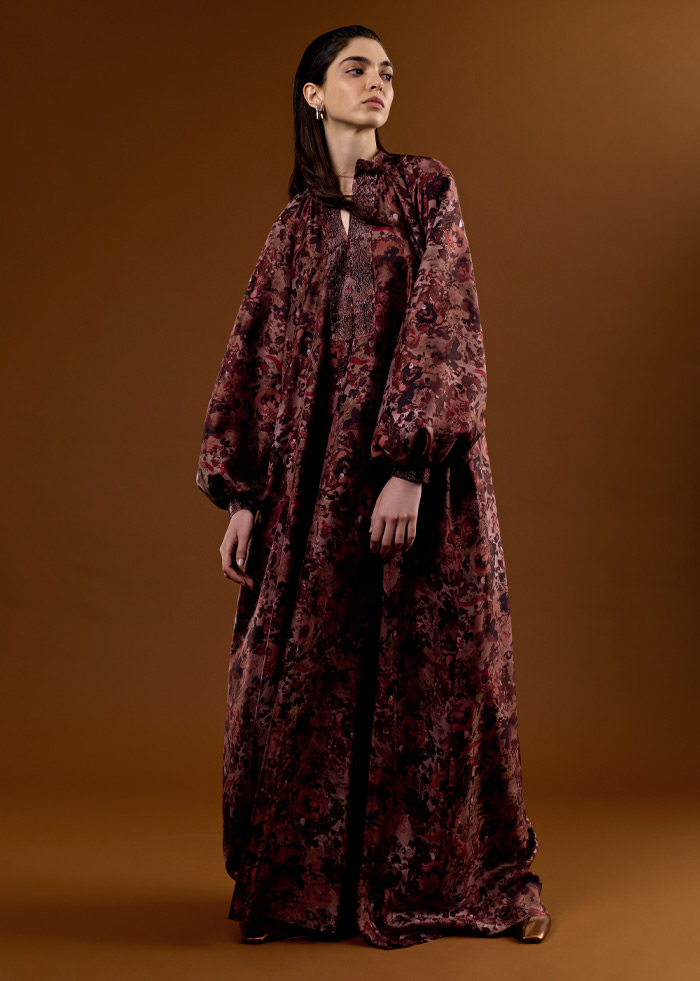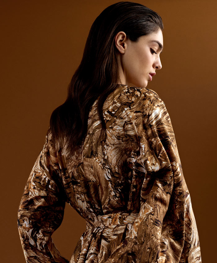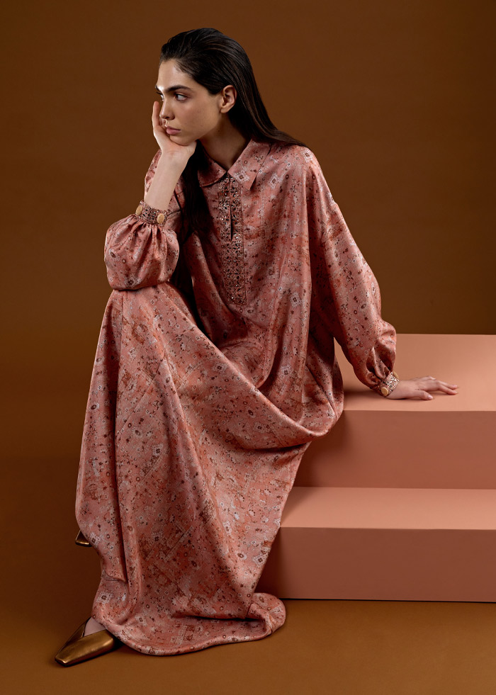 أزياء فاخرة مصنوعة بحرفية عالية من أجود أنواع الأقمشة، مثل الحرير والقطن وقماش "كادي" خفيف الوزن، ما يعكس التزام العلامة بأعلى مستويات الدقة والإتقان. كما تتزين التصاميم بتطريزات ونقوش أنيقة، بما فيها الفساتين الواسعة المطرزة بأحجار الكريستال اللامعة. وتبرز ضمن هذه المجموعة ملابس النوم الحريرية الجديدة، وهي عبارة عن تصميم من قطعتين متماثلتين مع سروال واسع وأنيق.