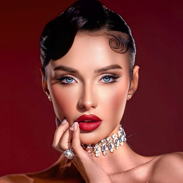 الأحمر هنا هو statement واضح لعيد الحب — لون أنثوي timeless يوازن بين نعومة البشرة وجرأة الحضور.