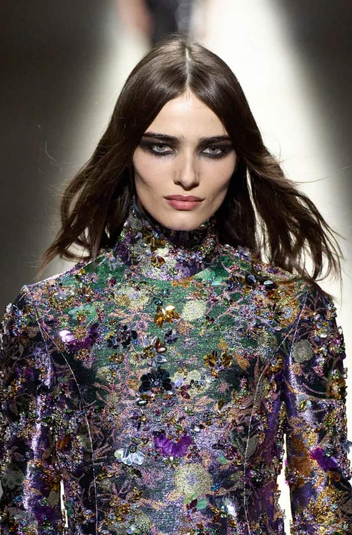 لكن التركيز الحقيقي كان على العينين. فقد رفع Sam Visser مستوى كثافة المكياج السموكي إلى درجة أعلى، إذ امتدت الظلال الرمادية من الزاوية الداخلية للعين على شكل هالة تصل إلى أعلى عظمة الحاجب، متدرجة تدريجياً نحو اللون الأسود الداكن. وعزّزت بعض الإطلالات برموش اصطناعية كثيفة للغاية، بينما زيّنت أخرى بخط آيلاينر ممتد حتى الصدغين. أما الحواجب، فكانت محددة بدقة لتقديم هذا المكياج القوي. إطلالة جمالية تنتمي تماماً إلى الصيحة القوطية الناعمة Soft Goth التي يتوقع أن تستمر بقوة في الشتاء المقبل.
