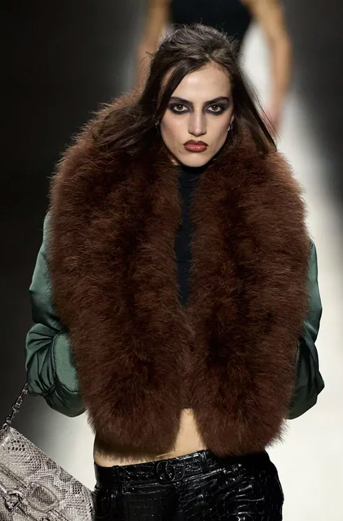 فكرة تجمع بين الدراما والشغف ولمسة من الفوضى. في العرض الأول المسرحي للمصمم ديمناDemna لدار غوتشي Gucci، ظهرت فساتين ضيقة للغاية وتفاصيل من الفرو الصناعي، قطع ليغينغ حادة التصميم وجوارب مزينة بشعار الدار، إضافة إلى تنانير جلدية مشقوقة... وللتناغم مع رؤية المصمم، ابتكر Sam Visser في المكياج إطلالات جمالية مسائية لافتة.