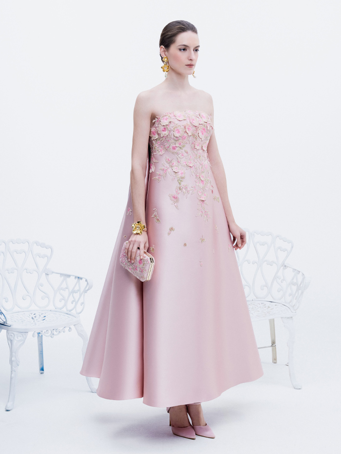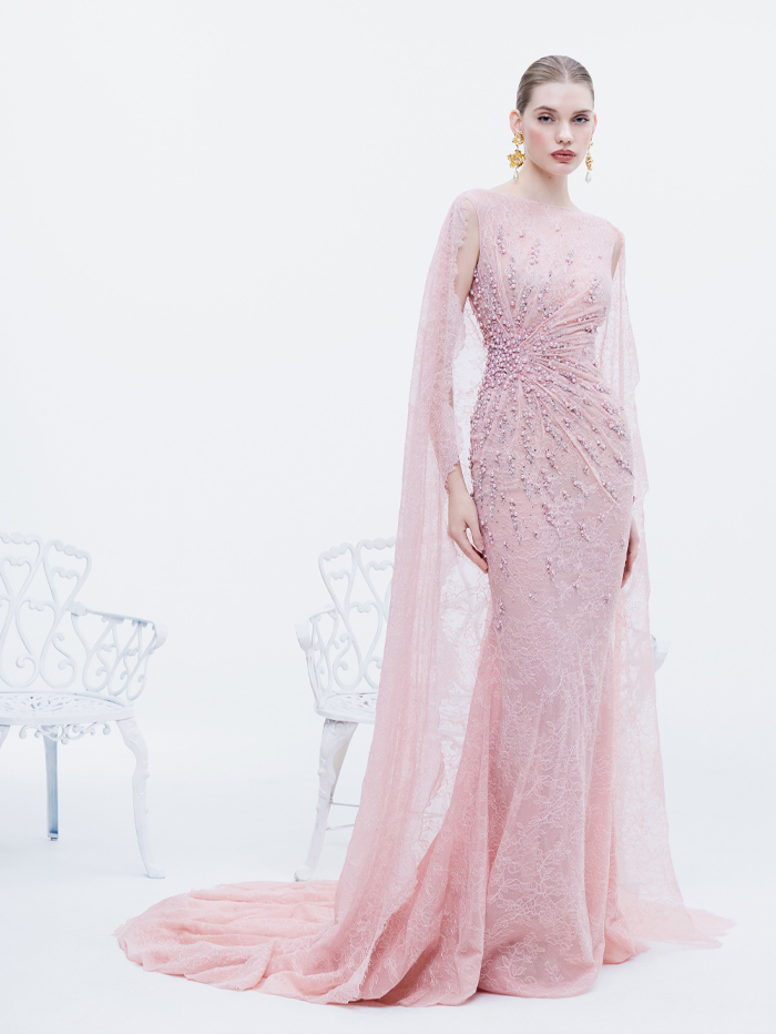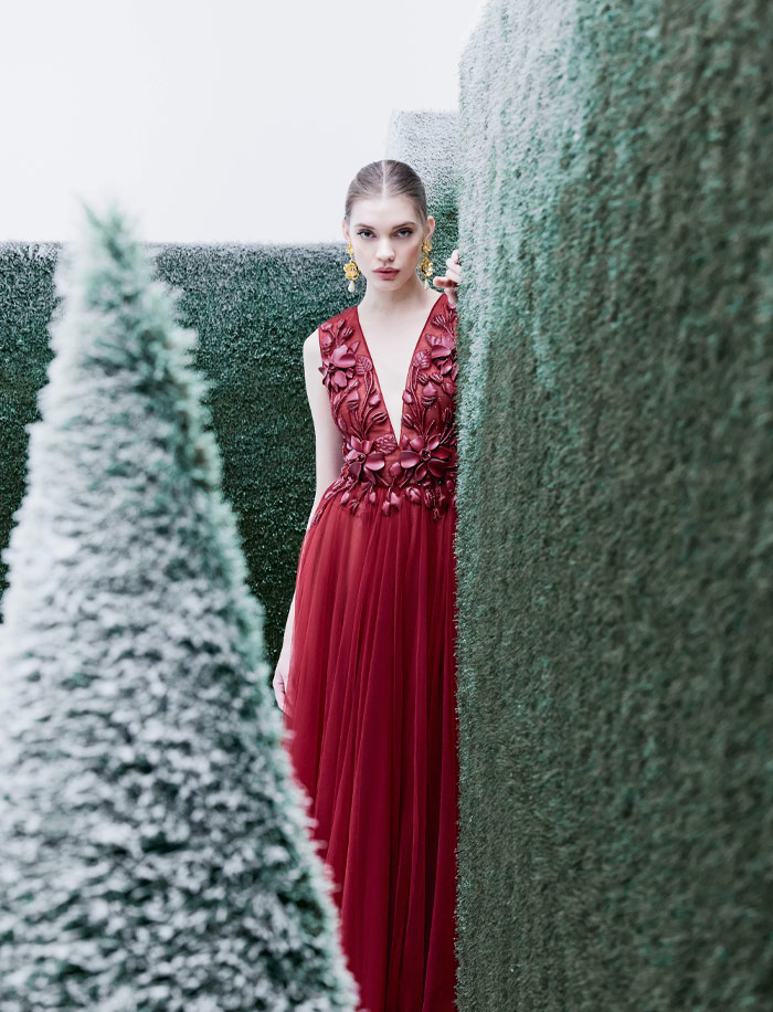تتجلّى هذه الرؤية في فساتين ذات أكمام منتفخة وتنّورات ضيّقة ترسم إيقاعاً أنثوياً، بينما تستحضر التطريزات الذهبية الزهرية ثراء الزخرفة وعظمة الحدائق الفرنسية. كما تنفتح الصدريات المشدودة على تنانير من التول الحريري، حيث تتلاشى الزهور تدريجياً، في انتقال شاعري من الكثافة إلى الرقة، ومن تنسيق الحدائق الصارم إلى مشاهد طبيعية أكثر نعومة وانسيابية.