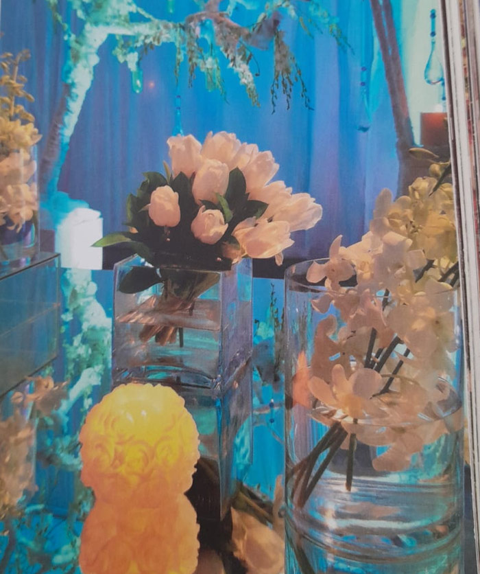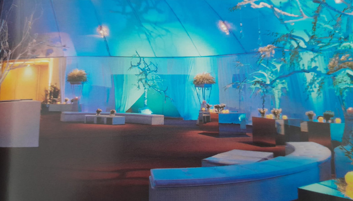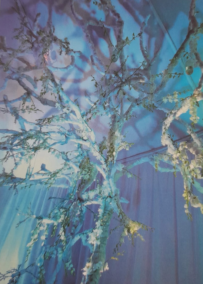 أشجار صناعية متناثرة في زوايا المكان، تخلّت عن اوراقها لتتشح باللون الأبيض، جذبت الأضواء الزرقاء لينعكس جمالها على ستائر المكان، لتخلق لوحات تتراقص بخفة على زوايا الخيمة...