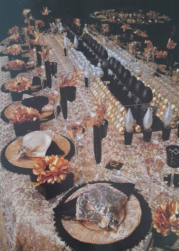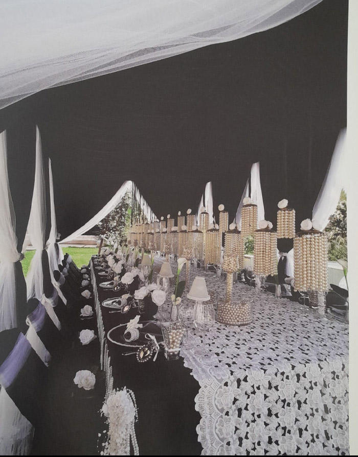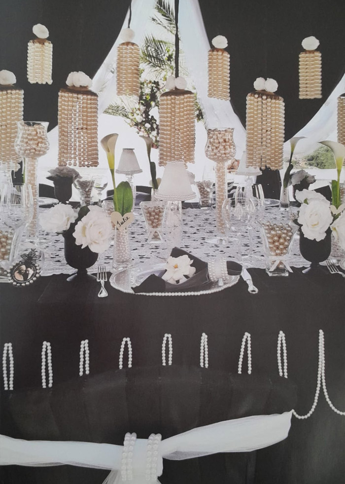 اللونان الأبيض والأسود تكررا في ستائر الخيمة ومختلف آنية واكسسوارات المائدة.. فالساتان الأسود يتماهى مع الأورغانزا الأبيض الذي يحاكي بدقة احجار اللؤلؤ التي تزدان بها الستائر السوداء. عقود اللؤلؤ تزين منتصف المائدة تتوجها أزهار بيضاء، على مفرش من الكروشيه الأبيض... آنية من البلكسي تحمل احجار اللؤلؤ على مفرش من الساتان الأسود، لتحول هذه المائدة، الأسود الى لون فرح يمتزج بأناقة مع أبيضٍ راقٍ.