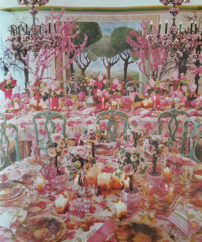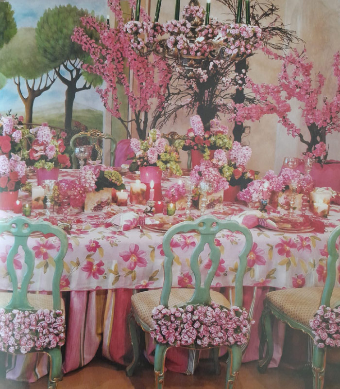 وتتالى القصص الربيعية في هذه المائدة الرائعة لصبح أشبه بحديقة تضج بالأزهار، فبدلاً من الاكتفاء بباقة واحدة، توزَّع باقات صغيرة وأخرى أكبر بأحجام وارتفاعات مختلفة لتزيّن باقات أخرى الأرضيات، وحتى الأسقف تحولت الى شلالات من الأزهار والأغصان الوردية، بينما تضفي الشموع الموزعة بين الباقات وهجًا دافئًا تنعكس على الأواني الزجاجية لتعزز الإحساس بالفخامة والجمال.