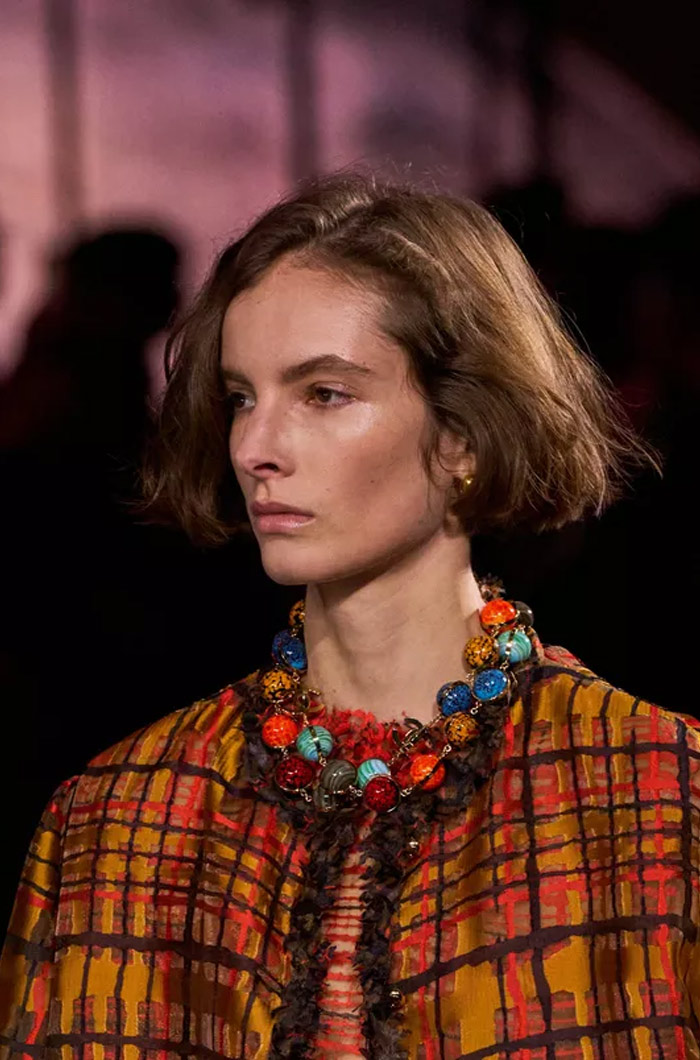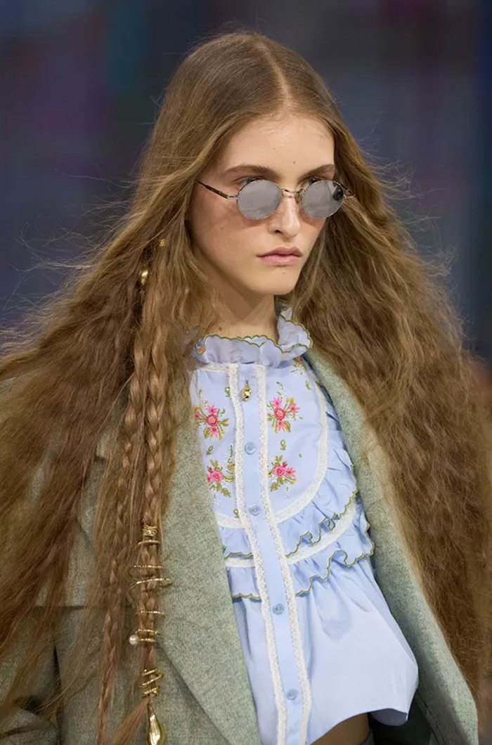 تعتبر هذه التسريحة من أكثر الصيحات التي لفتت الأنظار خلال أسبوع الموضة لخريف وشتاء 2026-2027، وهي تلهمنا منذ الآن. فقد قام مصفف الشعر Anthony Turner بتوزيع قطع ذهبية صغيرة داخل خصلات الشعر، جمعت بشكل عشوائي في ضفائر رفيعة.