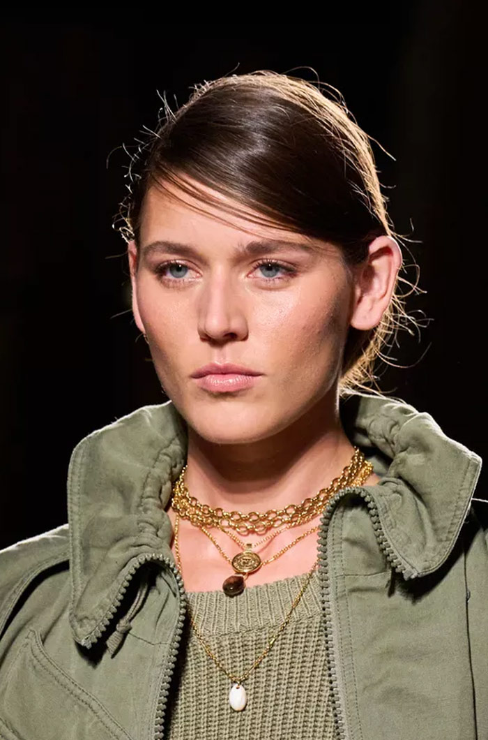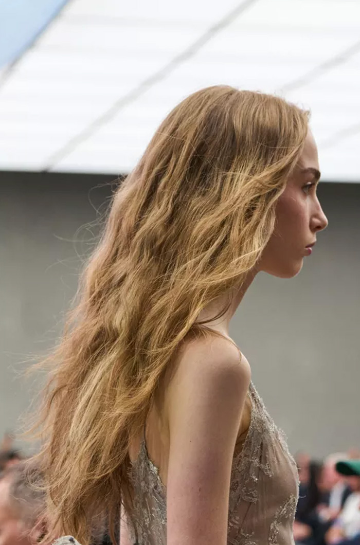 تترك الخصلات لتتألق بحريتها، وتتحرك كما تشاء، من دون تقييد. لمسة خفيفة من الزيت يومياً على الأطراف تكفي لتغذية الشعر وتنظيمه. الفكرة هي الحفاظ على شعر طبيعي قدر الإمكان، صحيّ ومفعم بالحيوية، كما ظهر في عروض Louis Vuitton وAje وDolce & Gabbana.
