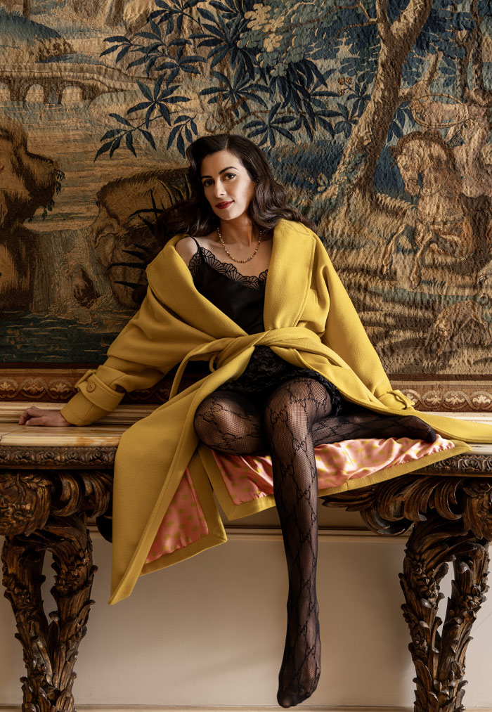 Black lace top, black skirt and yellow coat: MISS PS | Rose gold and diamond necklace: Tresoro Jewelry | Black Interlocking G Tights: Gucci