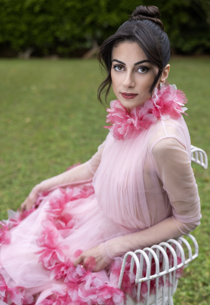 الزي بالنسبة لي هو، كما يقول المثل الفرنسي، “حبة الكرز على الكعكة” (la cerise sur le gâteau). هو اللمسة الأخيرة التي تكلّل كل جهود التحضير وتحوّل العمل إلى لحظة أناقة أنثوية تعكس شخصيتي على المسرح. أما لوني المفضل فهو الأزرق، لون البحر الصافي والسماء الواسعة، لون الحرية والانفتاح، لون الهدوء والتوازن. أشعر أنه يعكس شخصيتي إلى أبعد الحدود ويمنحني شعورًا بالراحة والثقة أثناء الأداء.