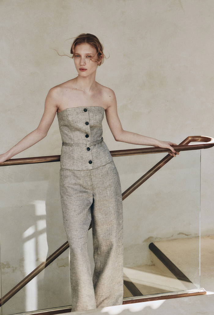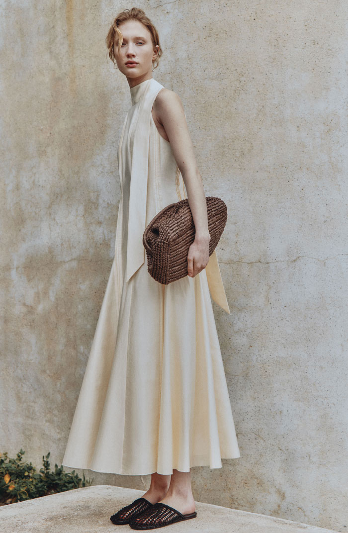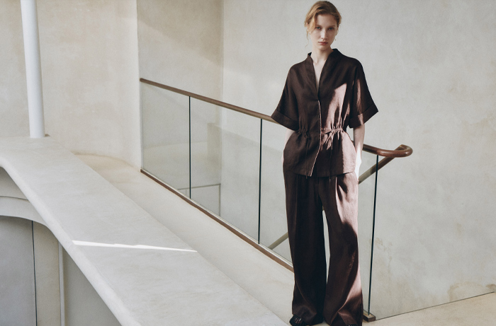 وتستند لوحة الألوان إلى درجات طبيعية هادئة، تشمل الأبيض، والبيج الدافئ، والرمادي الناعم، وصولاً إلى درجات البني الغنية، ما يعكس روح الصيف بأسلوب بسيط وأنيق. كما تضم المجموعة قطعاً أساسية متعددة الاستخدام، مثل قمصان الكتّان، والبناطيل المفصّلة، والفساتين الخفيفة، من فستان ميدي مخطط إلى تصميم “هالتر” ناعم من قماش التنسل.