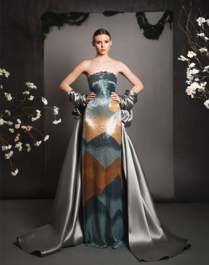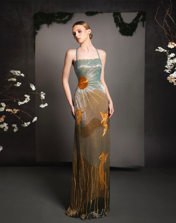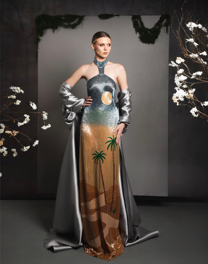 ومن بين التصاميم، برزت ثلاثة فساتين لما تحمله من ابتكار وتميز... فقد حملت طابعًا فنيًا مختلفًا من خلال نقوش مستوحاة من الطبيعة، مثل أشجار النخيل، الشمس، البحر، والصحراء... عناصر أضفت بُعدًا بصريًا غنيًا على المجموعة، وجعلت هذه الفساتين أشبه بلوحات فنية تعبّر عن مناظر طبيعية نابضة بالحياة.