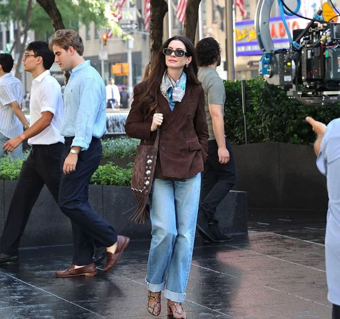 Anne Hathaway was spotted filming The Devil Wears Prada 2 carrying a Valentino studded suede bag