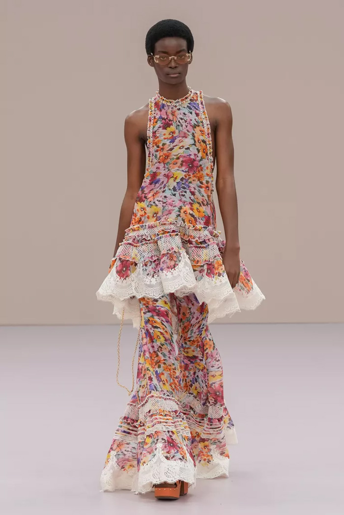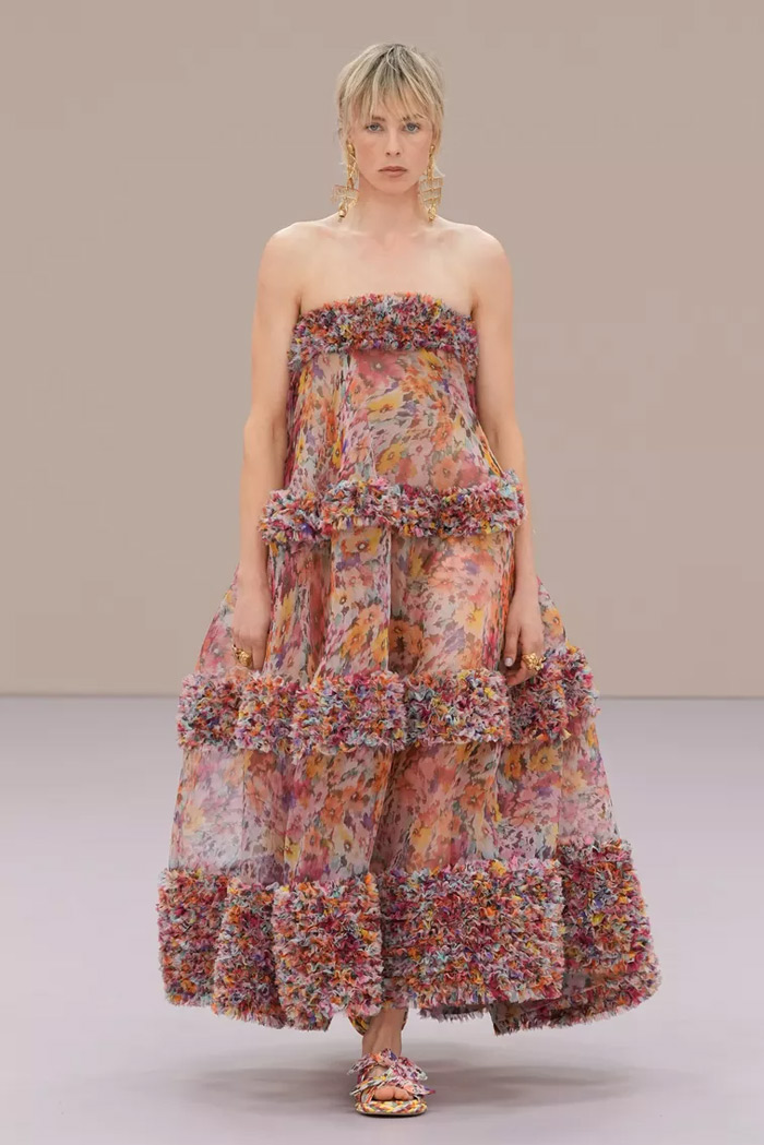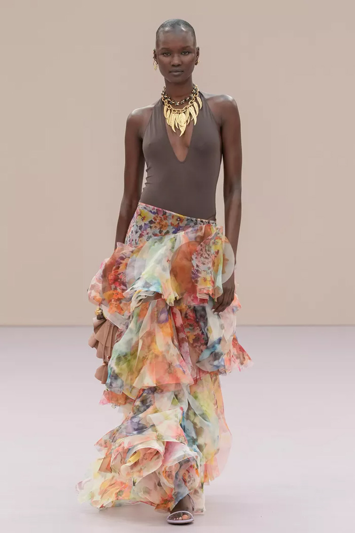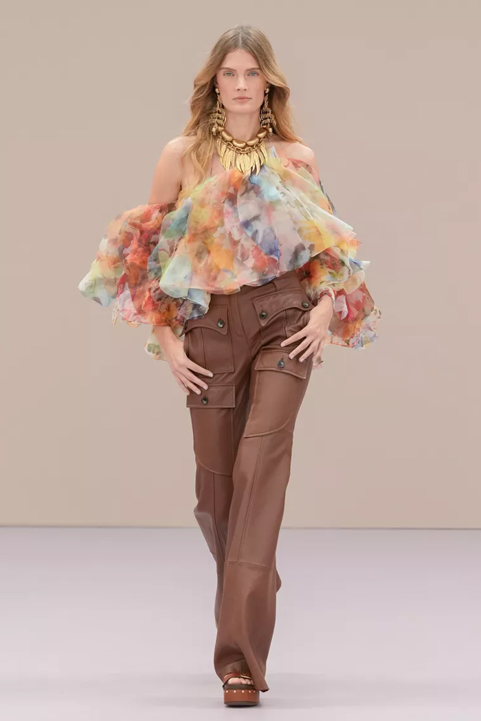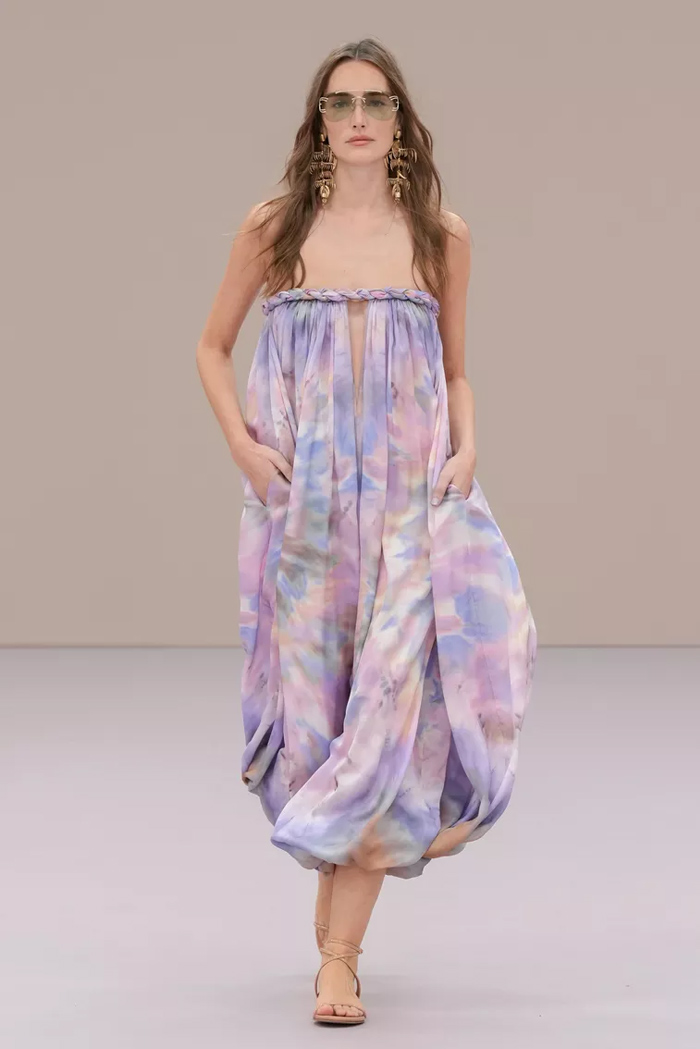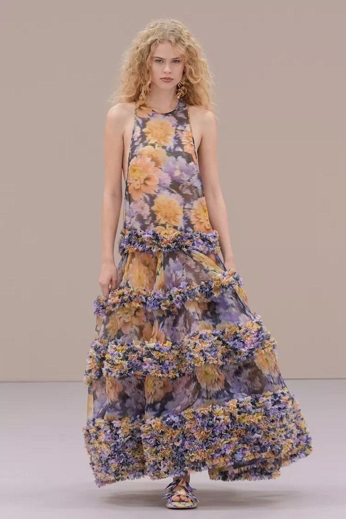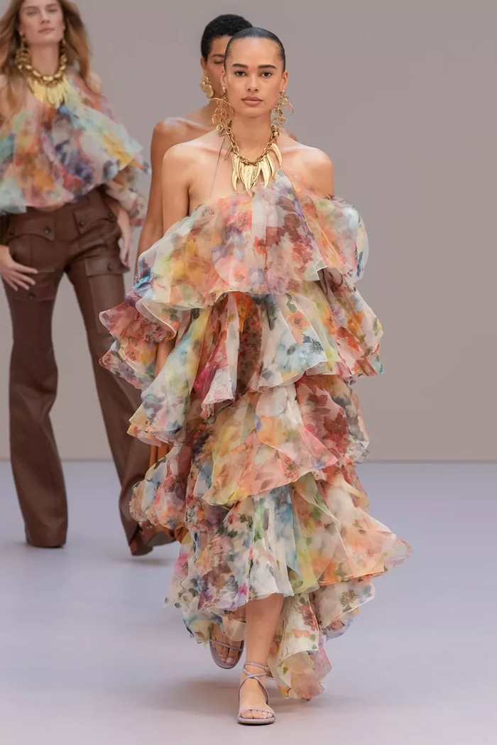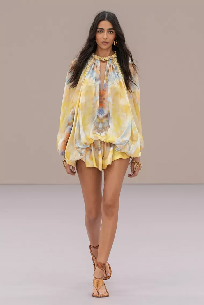 Shown at Le Carreau Du Temple, Zimmermann’s spring/summer 2026 collection, ‘Kindred Spirit’, stood out for its psychedelic prints, ’70s-inspired silhouettes, and playful use of denim. Offbeat colours, flouncing organza, and a mix of utility and femininity brought both fantasy and practicality to the runway, celebrating freedom and joy in exuberant shapes. The show was uniquely opened with a poem by Lana Del Rey, who was also present with her sister at the show among the first-row A-listers and guests.
