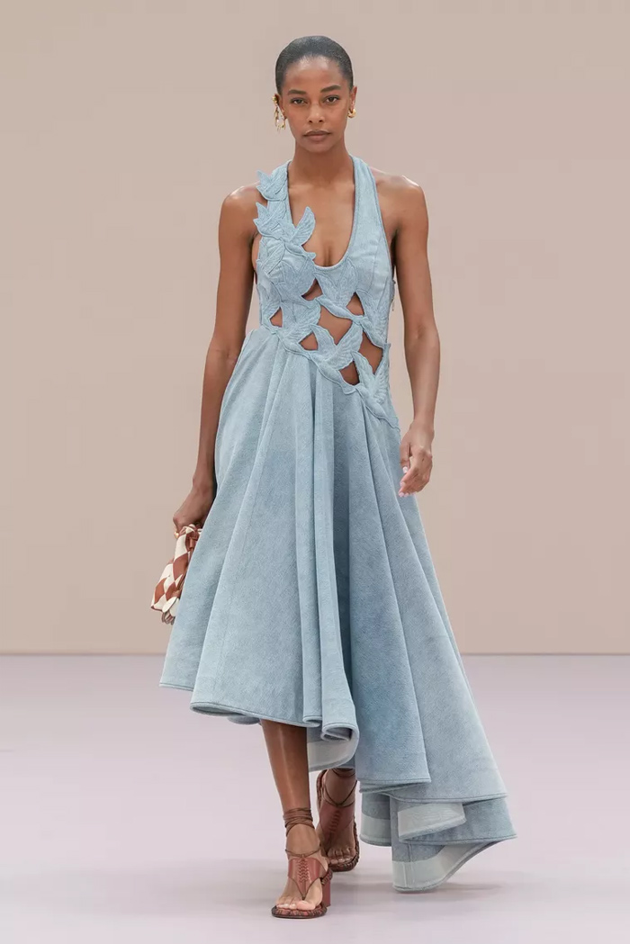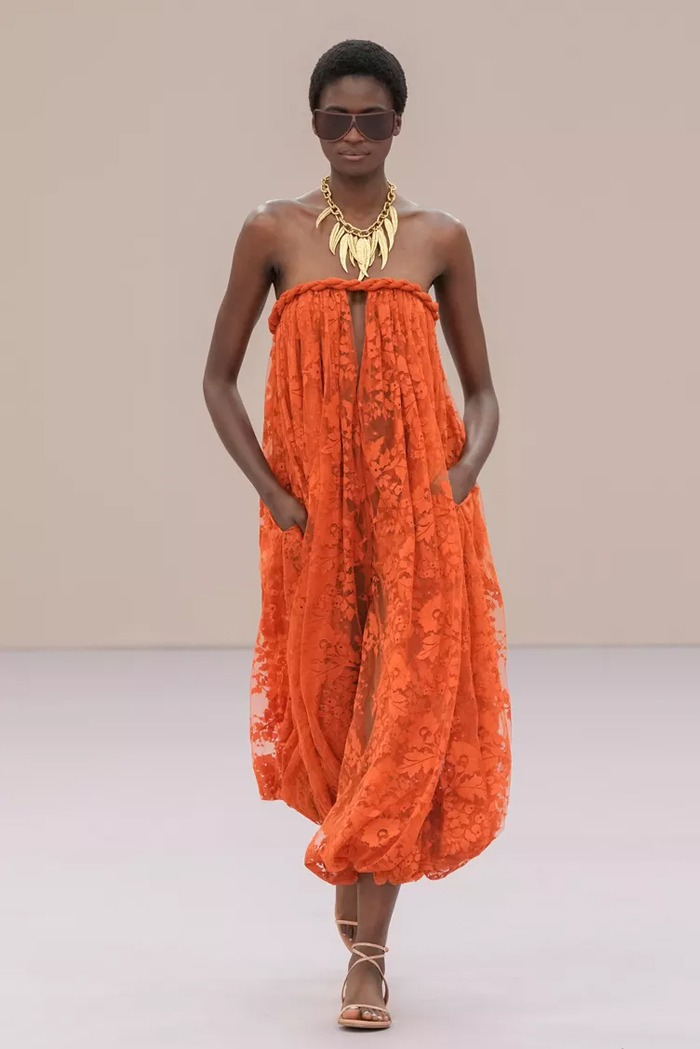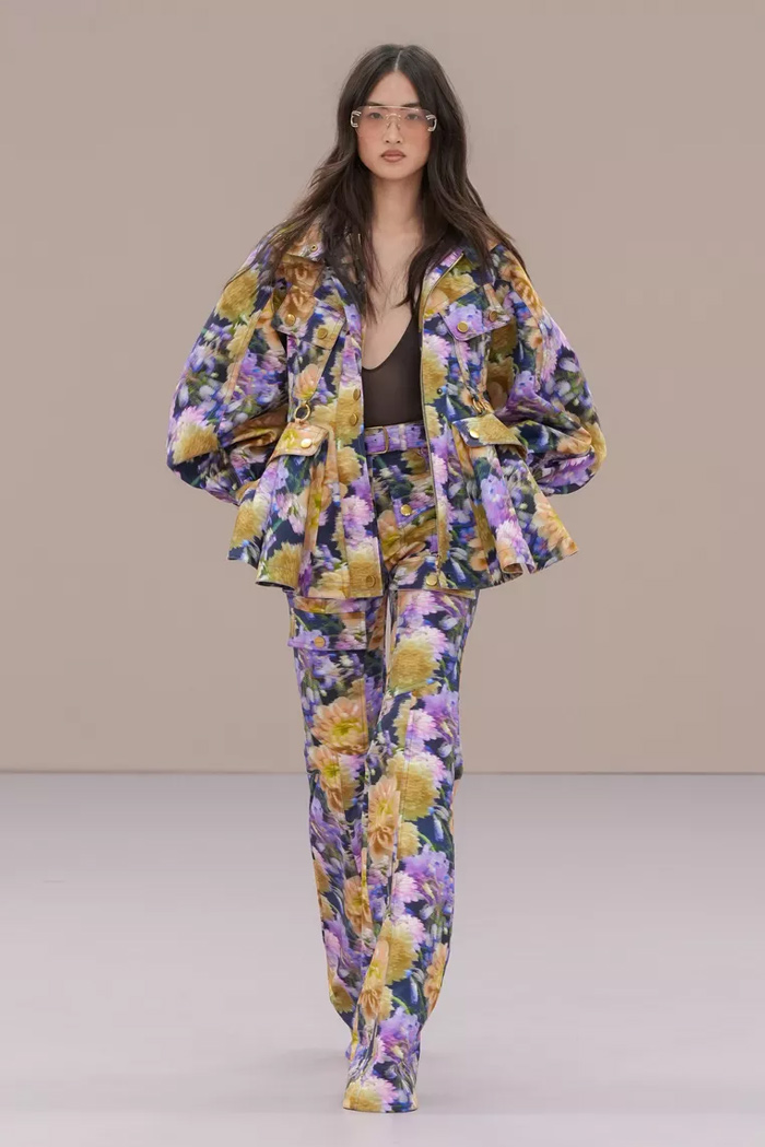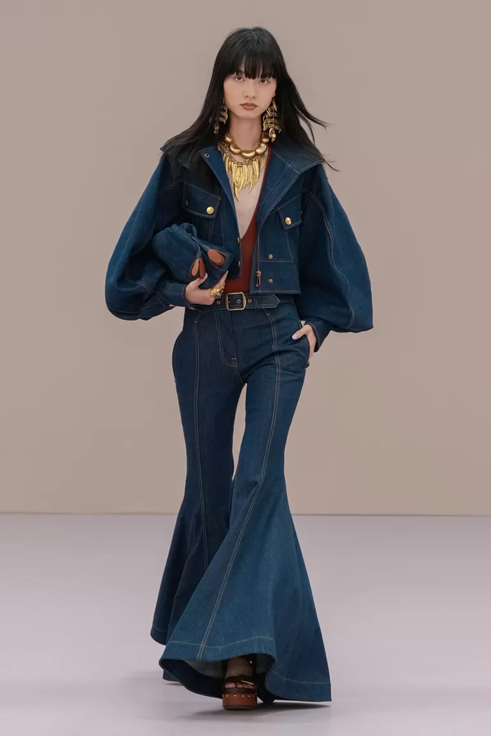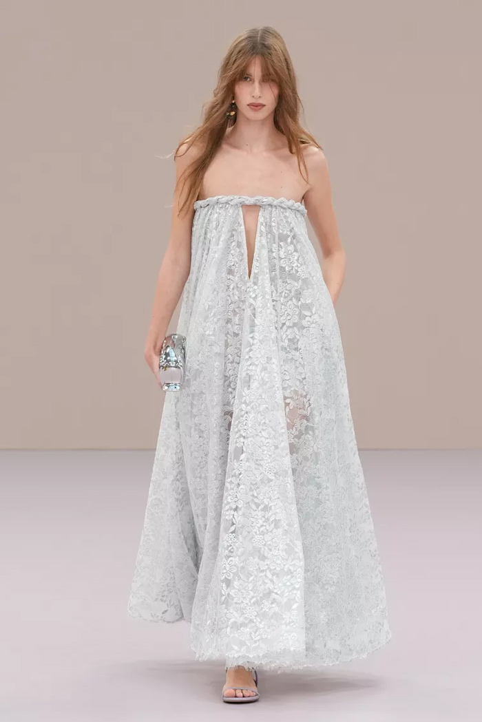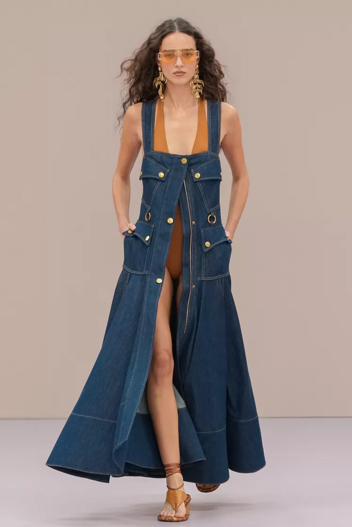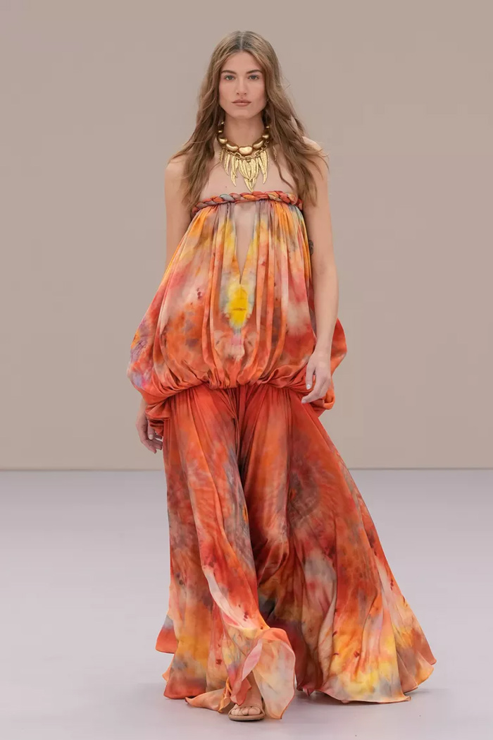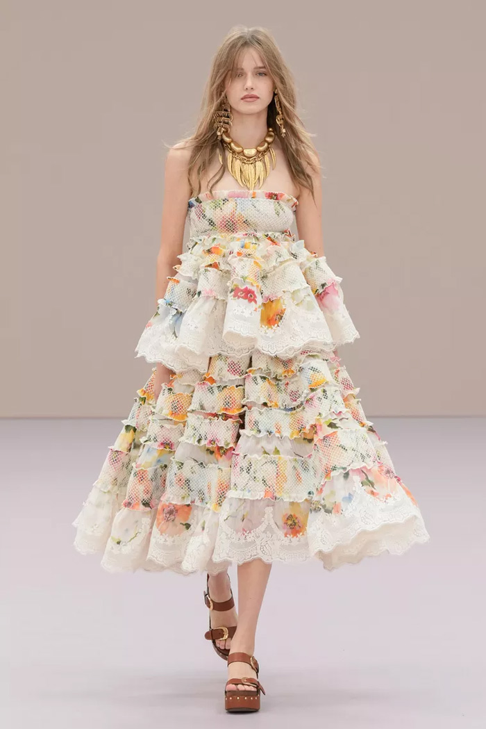 Shown at Le Carreau Du Temple, Zimmermann’s spring/summer 2026 collection, ‘Kindred Spirit’, stood out for its psychedelic prints, ’70s-inspired silhouettes, and playful use of denim. Offbeat colours, flouncing organza, and a mix of utility and femininity brought both fantasy and practicality to the runway, celebrating freedom and joy in exuberant shapes. The show was uniquely opened with a poem by Lana Del Rey, who was also present with her sister at the show among the first-row A-listers and guests.