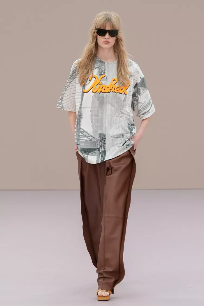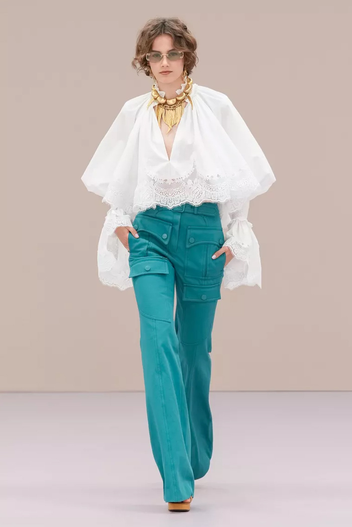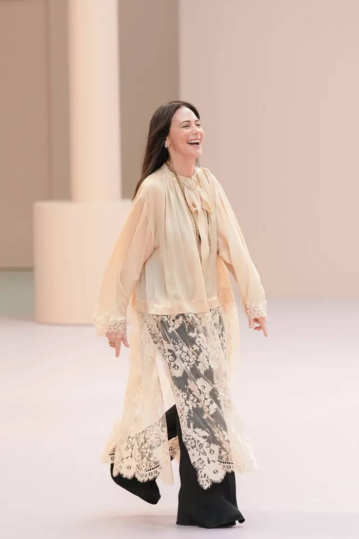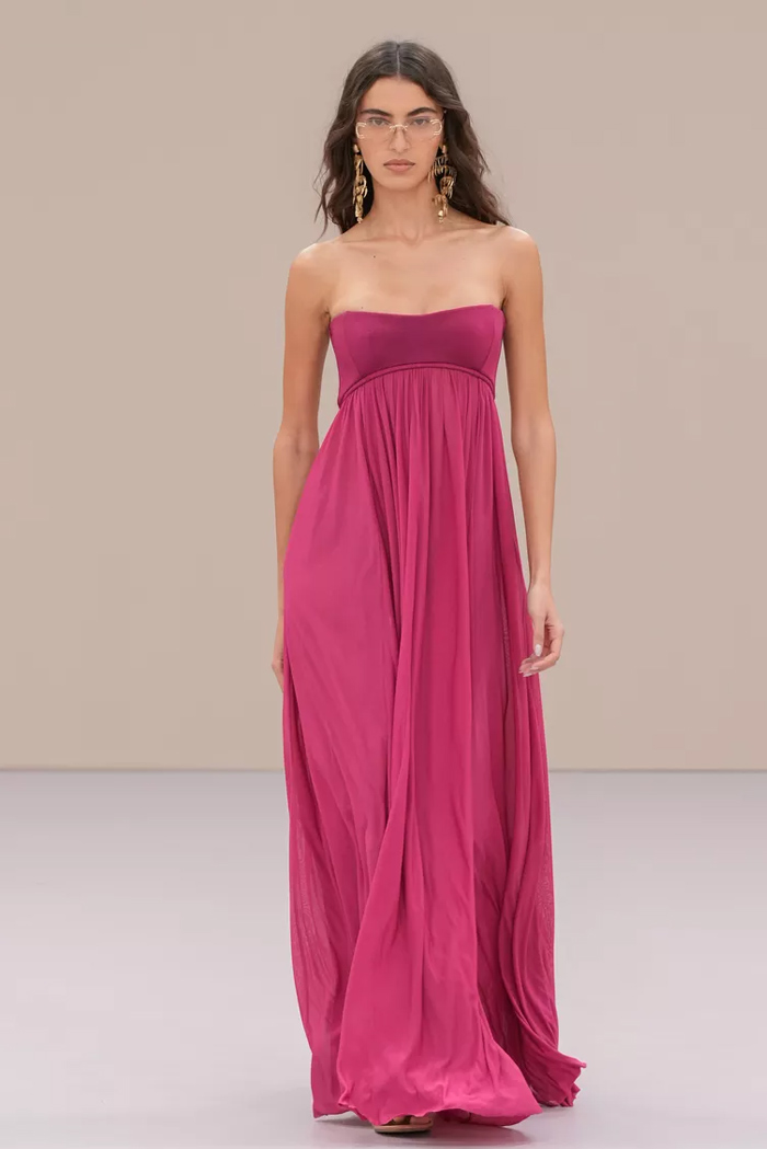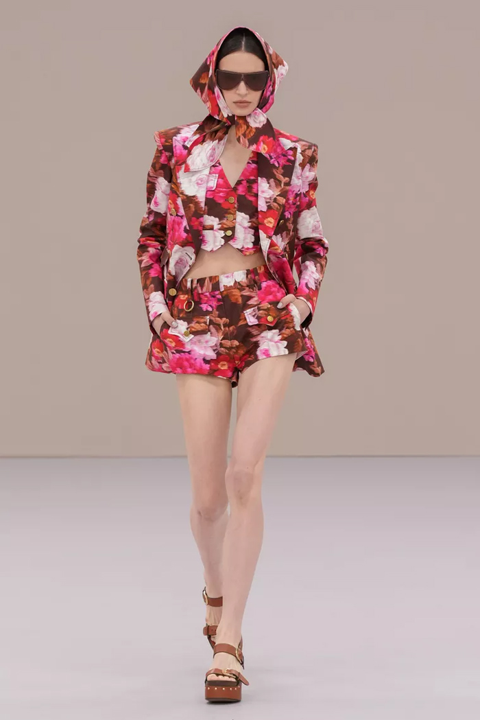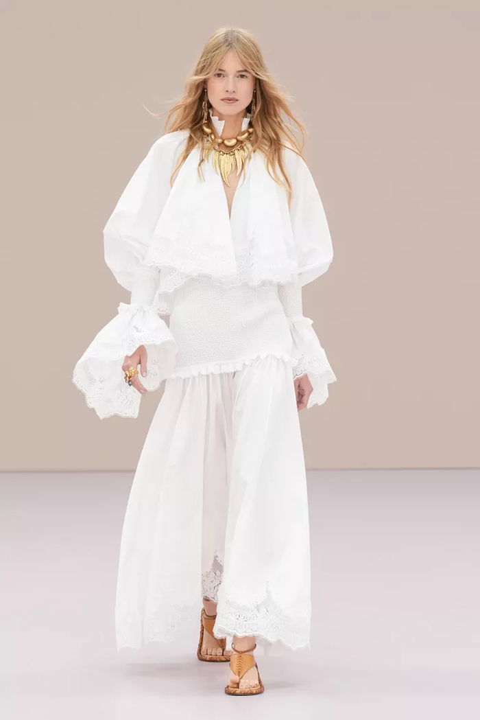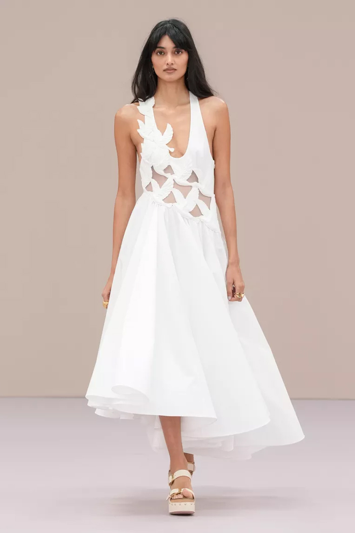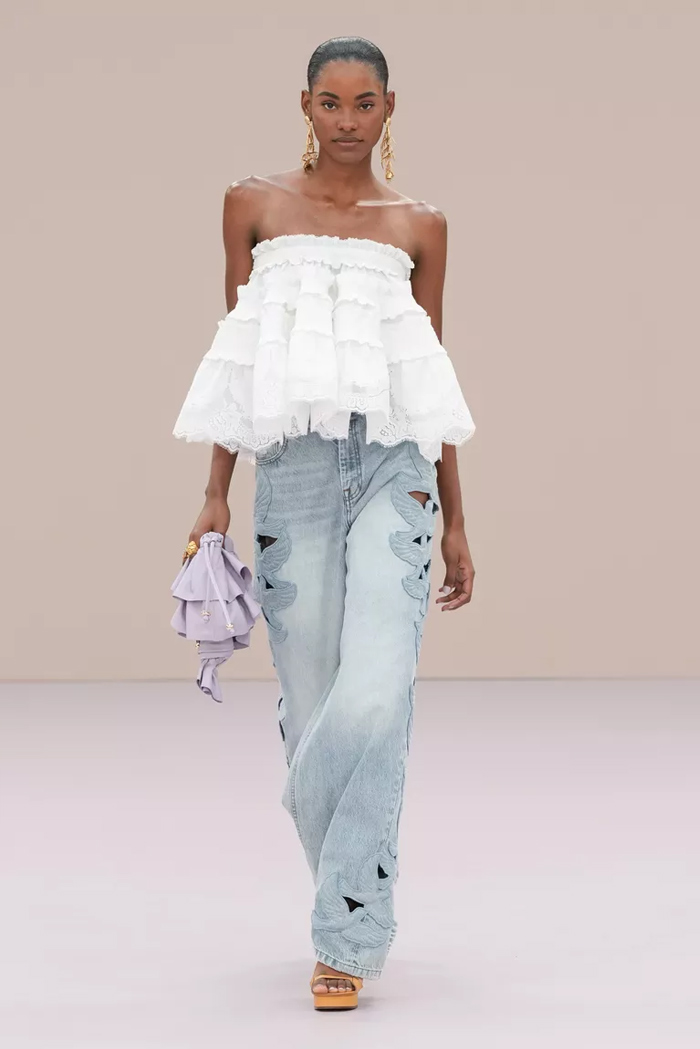 Shown at Le Carreau Du Temple, Zimmermann’s spring/summer 2026 collection, ‘Kindred Spirit’, stood out for its psychedelic prints, ’70s-inspired silhouettes, and playful use of denim. Offbeat colours, flouncing organza, and a mix of utility and femininity brought both fantasy and practicality to the runway, celebrating freedom and joy in exuberant shapes. The show was uniquely opened with a poem by Lana Del Rey, who was also present with her sister at the show among the first-row A-listers and guests.