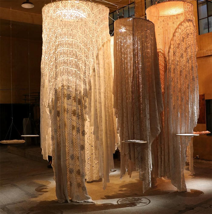 Surrounding the column, eight pieces from real trousseaus showcase precious, fading crafts — from Needlework and Smoking to Milan and Ajour, revealing the artistry and stories of the women who created them.