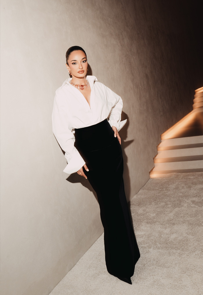 Amina Muaddi, Designer and Friend of the Maison, radiates in the Wave Illusion Necklace in Grey Platinum with Spinel and Ruby stones and Diamonds.