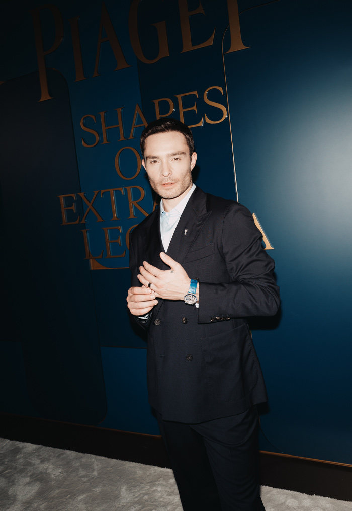Ed Westwick, American Actor and friend of the Maison, wears the Altiplano Precious Skeleton High Jewelry Watch in White Gold with Sapphire and Diamonds with a Blue Alligator Strap.