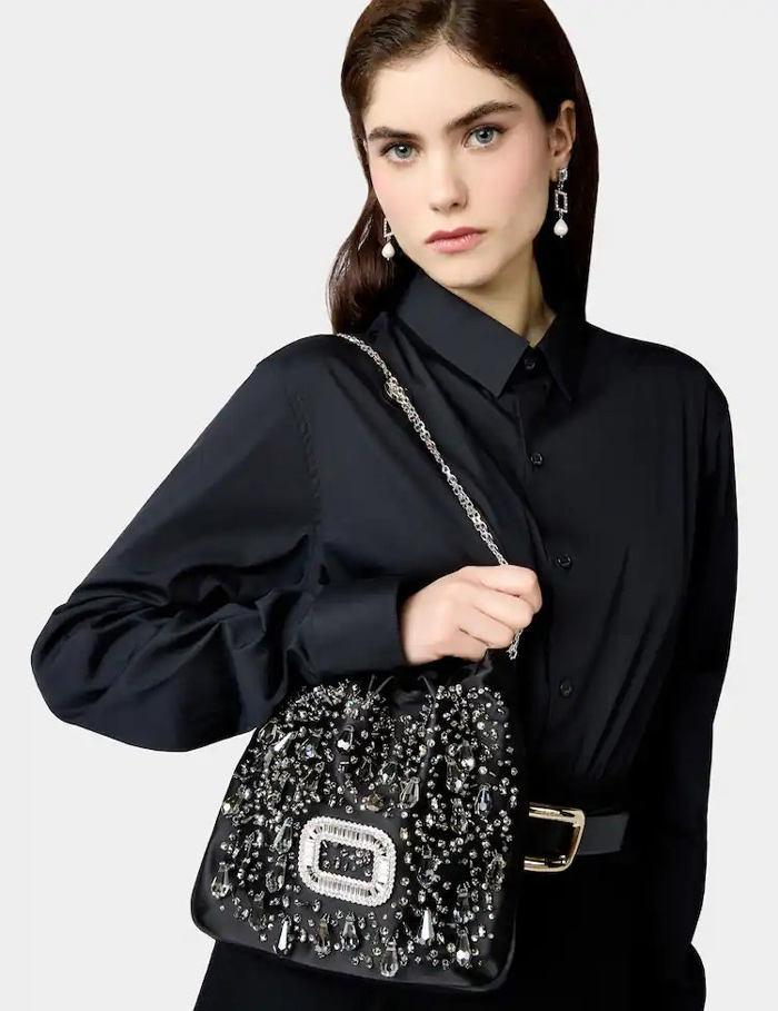 The accessories in the collection include unique pieces of intricate craftsmanship. You can match the black coat or the outfit you chose with the silver heels and bag.