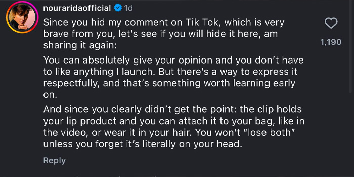 Soon, everyone had an opinion. Some defended Arida’s creativity; others critiqued the execution. And the conversation grew so loud that Nour herself had to step in and comment on a creator’s Instagram Reel to explain the idea and defend her vision, “The clip holds your lip product and you can attach it to your bag, like in the video, or wear it in your hair. You won’t “lose both” unless you forget it’s literally on your head.”