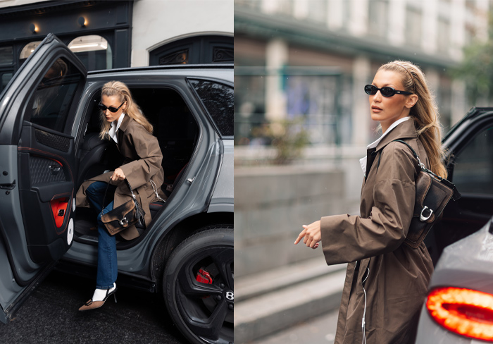 Street style icon Model Bella Hadid continued to champion Coach. At Paris Fashion Week, she was spotted carrying the Coach Tabby 26 Shoulder Bag in Loved Leather, showcasing the brand’s newest little black bag. This petite, structured shoulder bag reimagines an archival 1970s Coach design, featuring two detachable straps for hand-carry, short-shoulder, or crossbody wear, signature hardware, and a cluster of Coach charms.