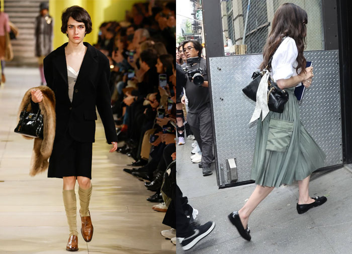 This winter, loafers are your answer if you’re aiming for structure without the weight of a boot. Victoria Beckham styled hers with fluid skirts for a clean, minimal silhouette, while Miu Miu leaned into visible socks and soft knits for a subtle collegiate edge. Anne Hathaway was spotted wearing sleek loafers on the set of The Devil Wears Prada 2.