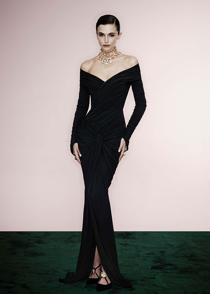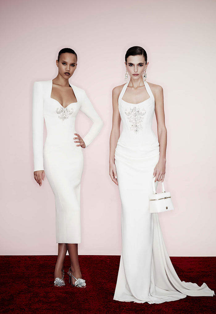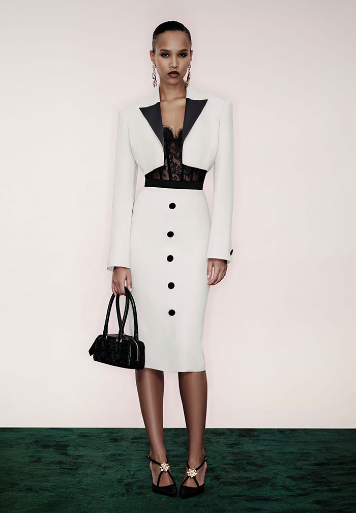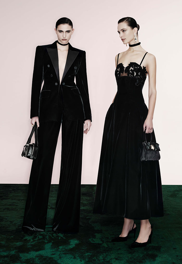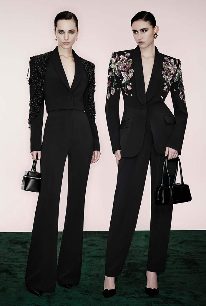 Resolutely modern and daring, in this collection the Lebanese international designer reinvents the refinement of the Belle Époque while reinterpreting its opulence to tell a story of femininity in all its complexity. Silhouettes revisit the allure of the Countess de Castiglione and the Marchesa Casati. The corset asserts itself, sculpting the waist and defining the figure, appearing over trousers, sketched onto tailoring, or reimagined as a secondskin top. Menswear tailoring becomes the collection’s feminine emblem: precise shoulders, elongated trousers, clean lines ignited by subtle details—mother-of-pearl buttons, meticulously designed brooches.