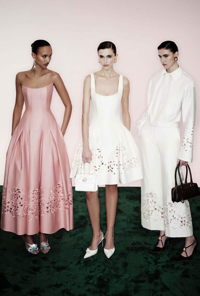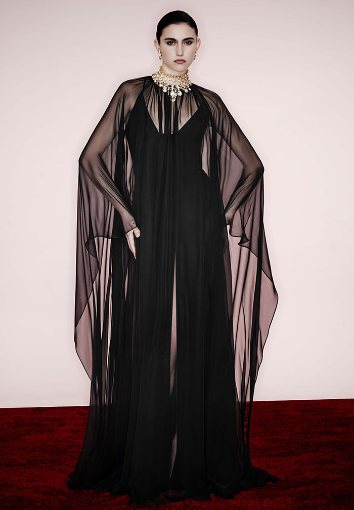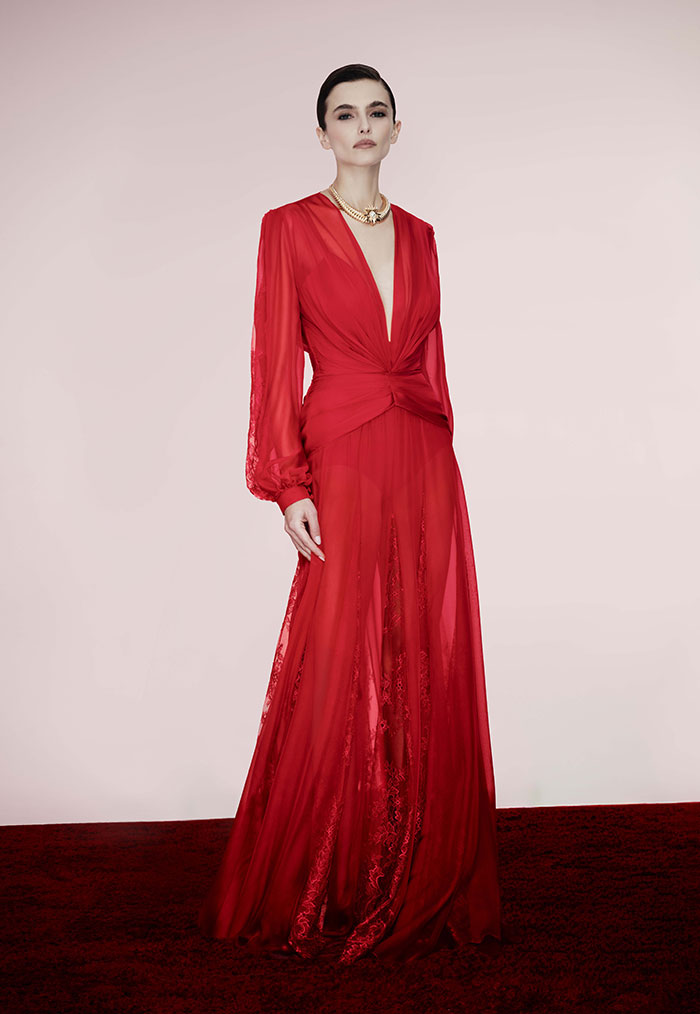 Long gowns set the tone with airy volumes, velvet shimmers, and slits that whisper the secrets of Parisian nights. Fabrics glide, drape, and glow like glass panels beneath the skylights of Parisian greenhouses. Graphic lace, ethereal transparencies, embroidered tulles, and liquid satins shape a contemporary wardrobe—bold and incandescent. Opalescent chiffons brush the skin like a breath of light. The color palette draws from hushed salons and opulent bouquets, blending luminous and blazing hues: powdered ivory, velvet black, kiss-red, absinthe green, patinated gold, and faded rose.