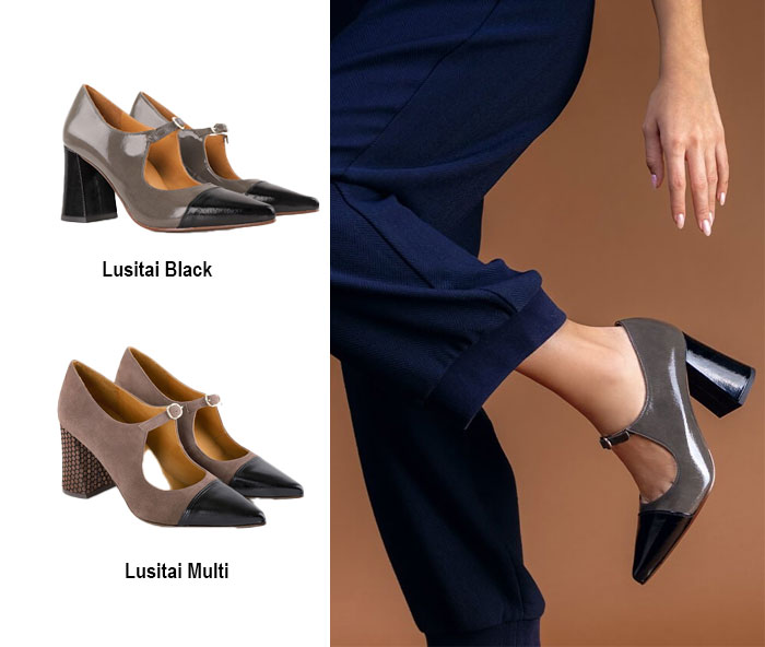 For a chic daytime look, style the Lusitai Multi or Lusitai Black with tailored navy or black trousers and a fluid blouse tucked. Add a structured shoulder bag and minimal gold jewelry to keep the focus on the architectural heel. For an evening look, swap the trousers for a black mini skirt or a long satin skirt.