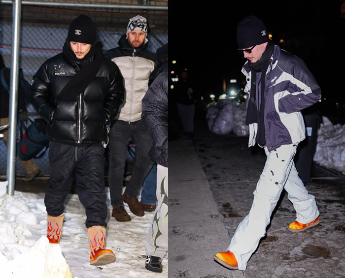 In New York City, Timothée Chalamet was seen sporting a rare pair of UGGs from the Jeremy Scott collaboration, paired with an oversized black puffer and a Chanel logo knit beanie. The boots have clearly become a winter go-to for Chalamet, who was also photographed wearing them the previous day with silver cargo pants draped over the shaft and a black reflective jacket.