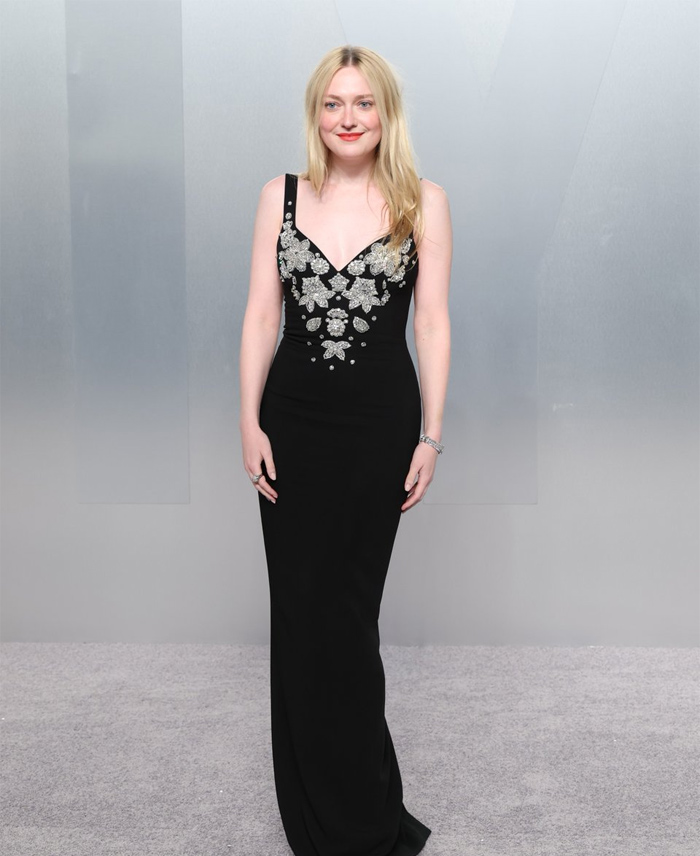 Actress Dakota Fanning dazzled in a black gown from the Zuhair Murad Spring 2026 Ready-to-Wear Collection, featuring a plunging neckline and intricate silver floral embroidery across the bodice, combining elegance with a modern, striking edge.