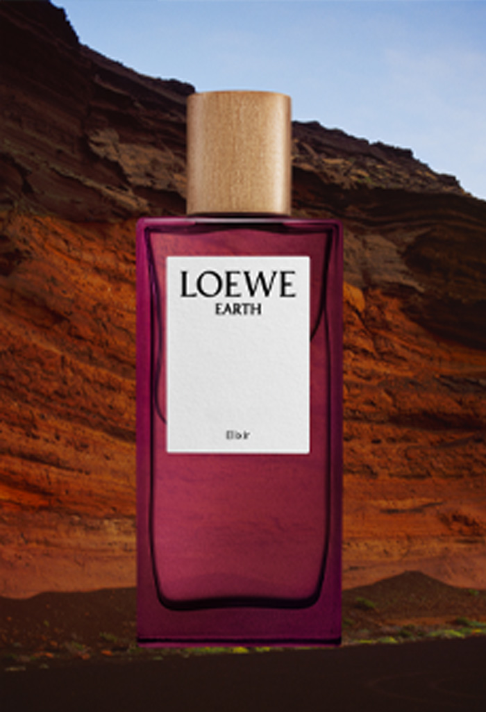 Elsewhere, LOEWE Solo Ella Elixir unfolds in soft, sunlit horizons, reflecting its feminine floral composition, while the purity of LOEWE 001 Woman is mirrored through luminous white rock formations sculpted over centuries. LOEWE Earth, rich with amber and musky notes, visualized through layers of burnt earth, while LOEWE 7 Elixir channels the enigmatic allure of unexplored terrain.
