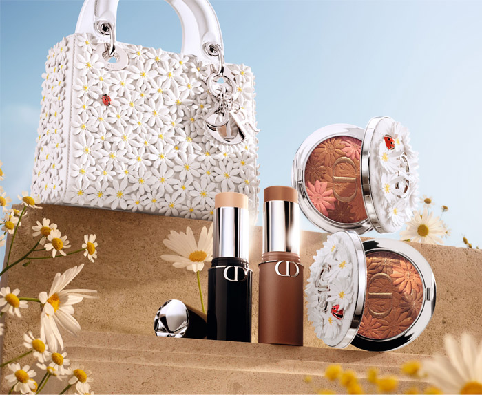 A romantic, pop-inspired Dior collection blooms with daisy motifs across limited editions of Dior Forever Nude Bronze Glow and Glow Luminizer, housed in cannage cases adorned with a lucky ladybug.