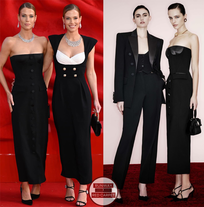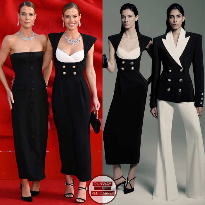 Her sister, Lady Eliza Spencer, opted for a sleek black midi dress featuring metallic button detailing, elevated by a contrasting white draped bustier from the Zuhair Murad Ready-to-Wear Spring 2026 collection.