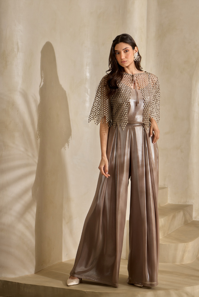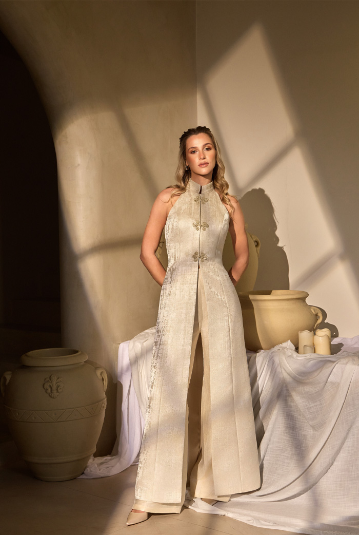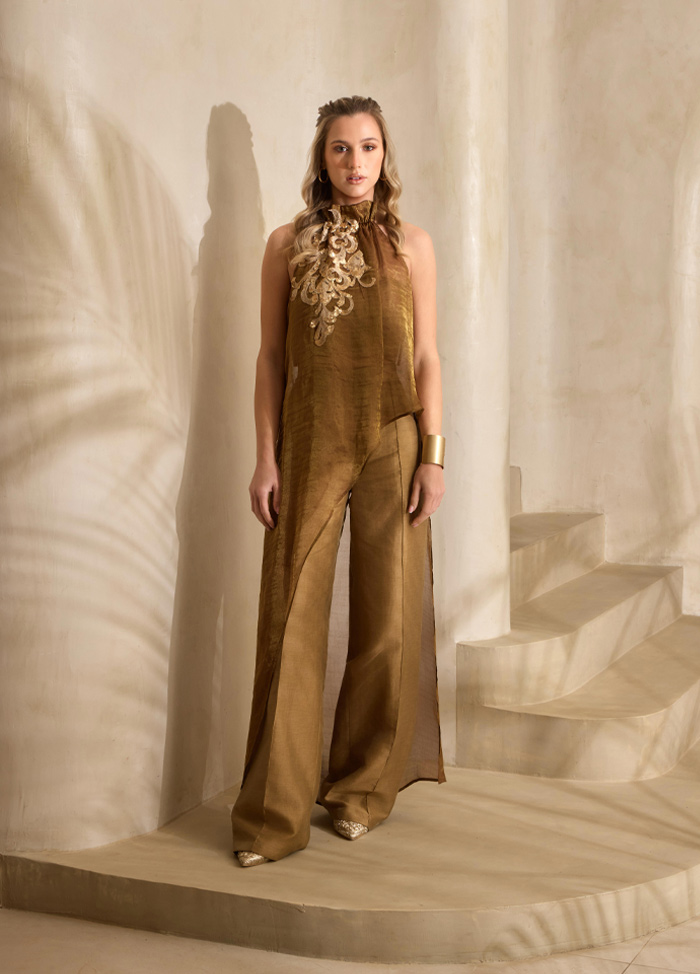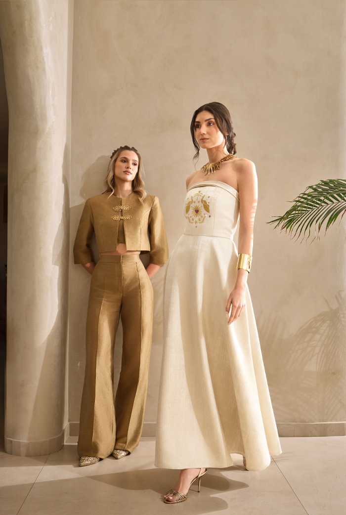 Crafted from carefully sourced, high-end fabrics, including mousseline, satin, wild silk, brocade, crepe and guipure, the collection reflects a commitment to quality and detail. Each piece is elevated through artisanal techniques such as applique, embroidery, and gold-plated embellishments, adding depth, texture, and a refined luminosity.